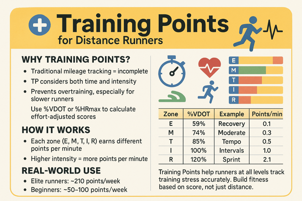 • การจัดการภาระการฝึกด้วย Training Points: เอกสารยังเสนอระบบ “training points” ที่เป็นนวัตกรรมใหม่ เพื่อวัดภาระการฝึกโดยรวม. ระบบนี้ให้ค่าคะแนนต่อนาทีตามความเข้มข้นของการวิ่ง ทำให้สามารถติดตามปริมาณความเครียดในการฝึกได้แม่นยำกว่าการนับเพียงระยะทาง. ช่วยให้นักวิ่งทุกระดับความสามารถสามารถจัดการภาระการฝึกได้อย่างเหมาะสม และป้องกันภาวะ overtraining.