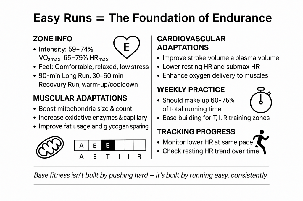 • Easy Runs เป็นฐานราก: การวิ่งโซน E หรือ Easy runs เป็นหัวใจหลักในการสร้างพื้นฐานที่แข็งแรง. เป็นการพัฒนาระบบหัวใจ-หลอดเลือดและการปรับตัวของกล้ามเนื้อ ซึ่งเป็นรากฐานสำคัญที่ทำให้การฝึกที่ความเข้มข้นสูงสามารถทำได้.