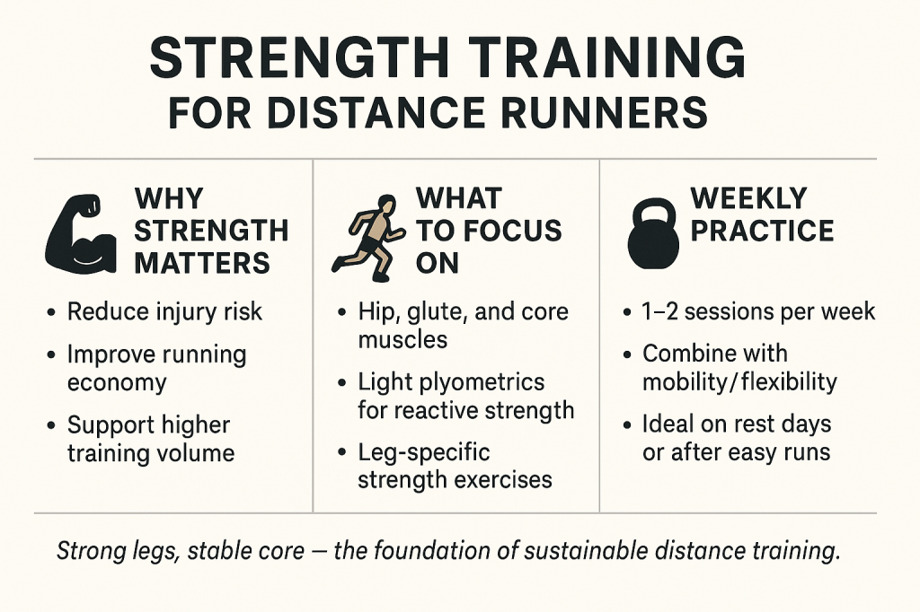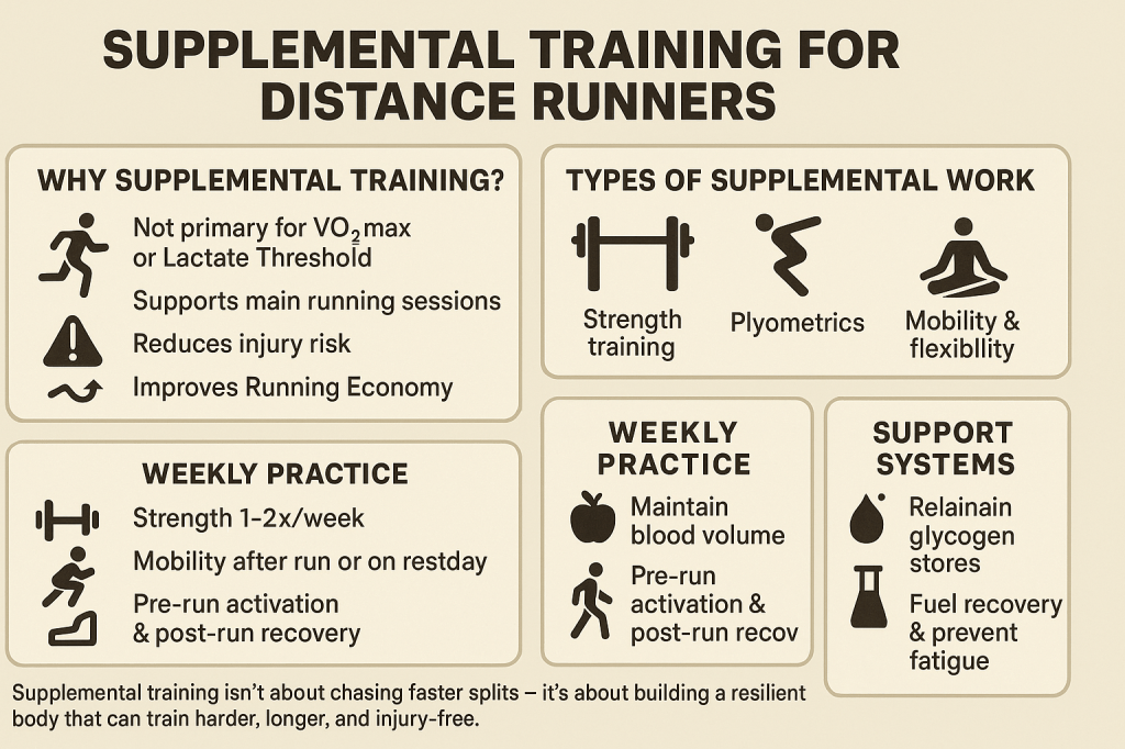 แม้จะไม่ใช่แกนหลักในการพัฒนา VO₂max หรือ Threshold แต่ การฝึกเสริม อย่าง Strength Training, Mobility/Flexibility, โภชนาการ และการให้น้ำ ล้วนเป็นปัจจัยที่ช่วยให้นักวิ่งรับภาระการฝึกได้มากขึ้น ลดการบาดเจ็บ และวิ่งได้ประหยัดพลังงานมากขึ้น