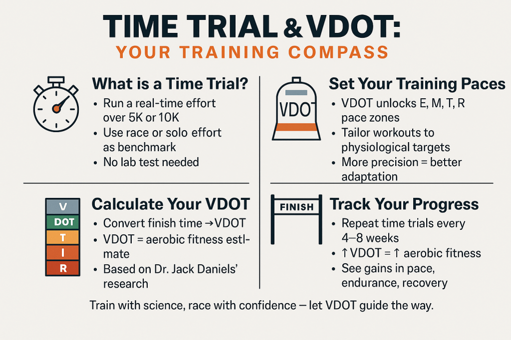 เพื่อให้การฝึกมีประสิทธิภาพ นักวิ่งต้องรู้ว่า “ควรฝึก pace ไหน เพื่อให้ร่างกายตอบสนองตามเป้าหมาย” ระบบ VDOT คือหัวใจในการเชื่อมโยงข้อมูลทางวิทยาศาสตร์กับสนามวิ่งจริง โดยคำนวณจากเวลาแข่งขันหรือ Time Trial ช่วยให้กำหนด Training Paces ได้แม่นยำ โดยไม่ต้องเข้าห้องแล็บ