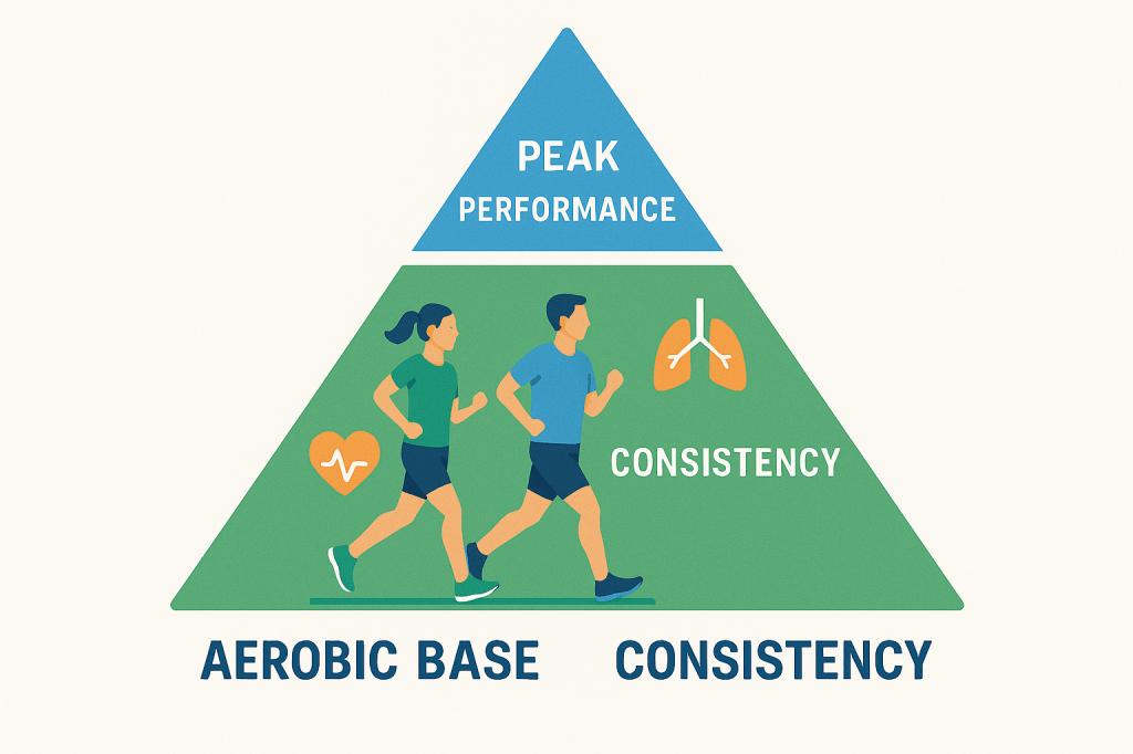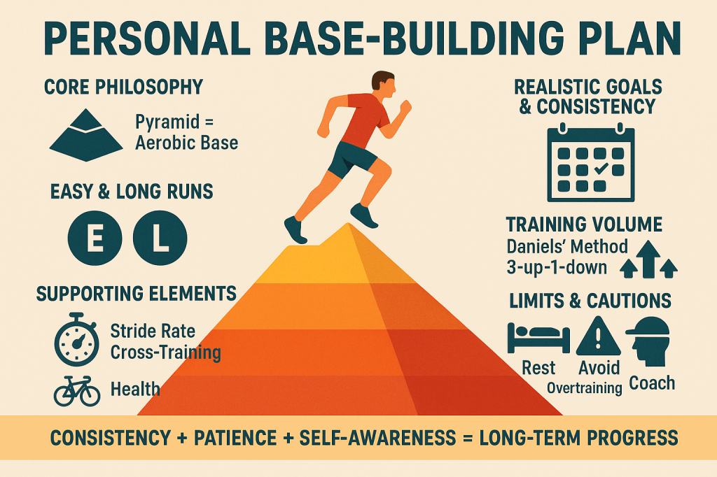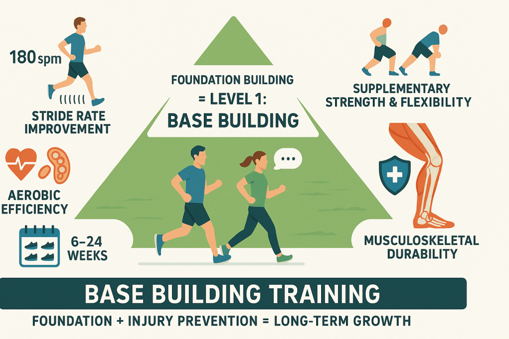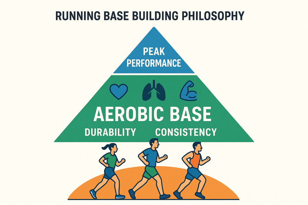 1. ปรัชญาหลักของการสร้างฐาน (Core Philosophy of Base Building) ปรัชญาโดยรวมของการสร้างฐานการวิ่งเปรียบเสมือนปิรามิด โดยฐานแสดงถึงช่วงของการพัฒนาแอโรบิก เป้าหมายทางสรีรวิทยาที่สำคัญสองประการของขั้นตอนนี้คือ การเพิ่มประสิทธิภาพแอโรบิก และ การสร้างความทนทานของระบบกล้ามเนื้อและกระดูก การฝึกซ้อมควรเป็นการวิ่งที่มีความเข้มข้นต่ำและสม่ำเสมอ หรือที่เรียกว่า “การวิ่งที่คุยกันได้” (conversational pace) เพื่อให้ร่างกายเกิดการเปลี่ยนแปลงเชิงโครงสร้าง เช่น การเพิ่มจำนวนเซลล์เม็ดเลือดแดง, ปริมาตรหัวใจห้องซ้ายที่ใหญ่ขึ้น, และความหนาแน่นของไมโทคอนเดรียที่มากขึ้นในเซลล์กล้ามเนื้อ