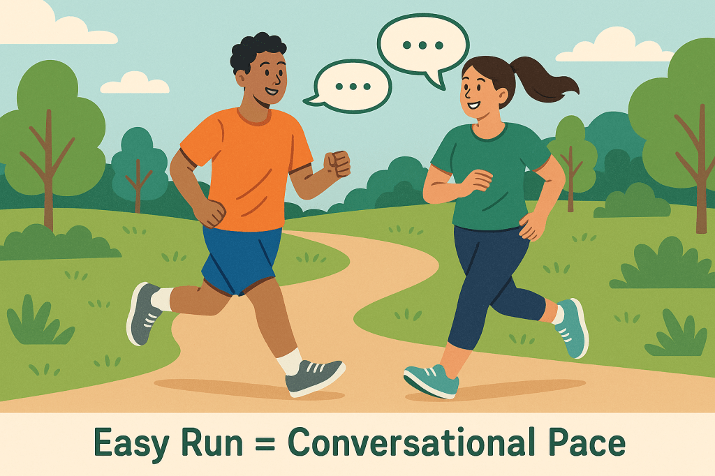 - การกำหนดจังหวะ (Pacing): การวิ่งทั้งหมด (ยกเว้น strides เป็นครั้งคราว) ควรกระทำใน “จังหวะการสนทนา” (conversational pace) ที่สบาย ซึ่งหมายความว่าคุณสามารถพูดคุยเป็นประโยคที่สมบูรณ์ได้โดยไม่หอบ