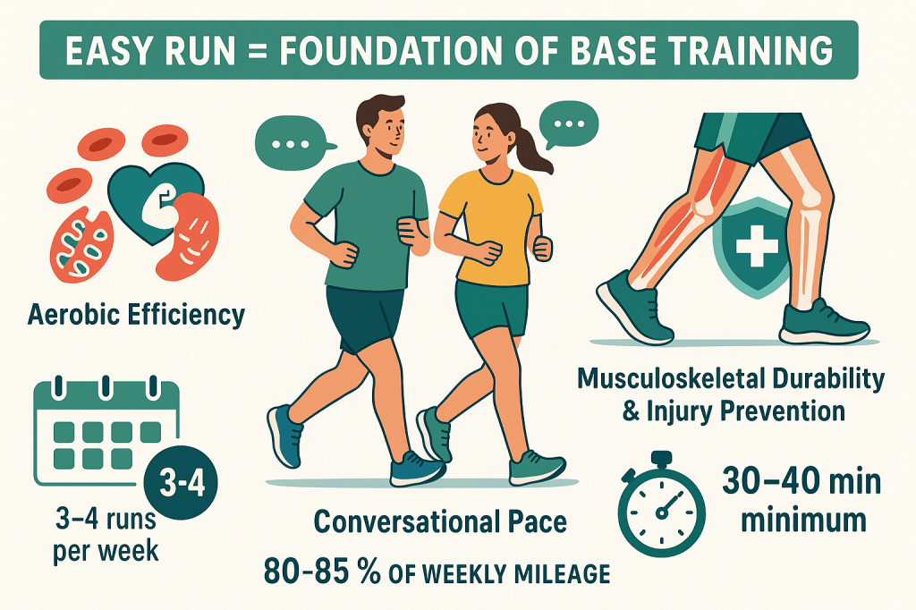 • ลักษณะสำคัญ: งานหลักในช่วงนี้เกี่ยวข้องกับการให้ร่างกายได้รับความเครียดต่ำ ซึ่งมักเป็นจังหวะที่เรียกว่า “จังหวะสนทนา” (conversational pace) เพราะช่วยให้นักวิ่งสามารถพูดคุยได้อย่างต่อเนื่องโดยไม่หอบ การเน้นการวิ่งช้าและความเข้มข้นต่ำนี้เป็นการกระตุ้นทางสรีรวิทยาอย่างจงใจ ไม่ใช่สัญญาณของการออกแรงไม่เพียงพอ
