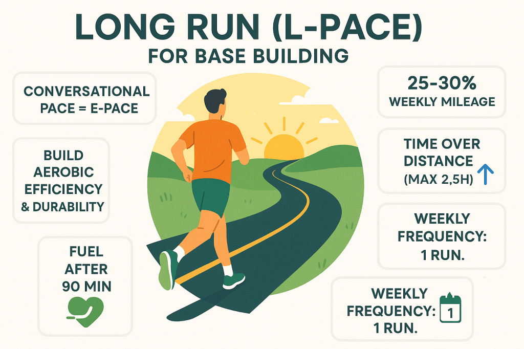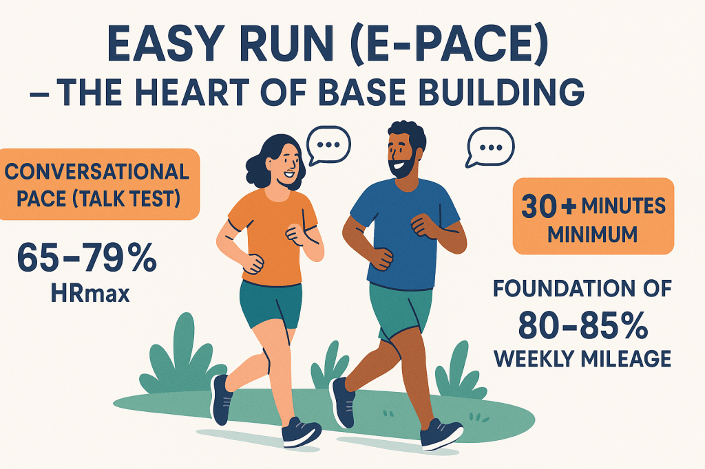 • การวิ่งเบา (Easy Runs – E-pace) และการวิ่งระยะไกล (Long Runs – L-pace): กิจกรรมหลักทั้งสองประเภทนี้จะทำด้วยความเร็วที่ “คุยกันได้” (conversational pace) ซึ่งเป็นความเร็วที่สามารถพูดประโยคเต็มๆ ได้โดยไม่เหนื่อยหอบ การวิ่งเบาอย่างน้อย 30 นาทีต่อครั้งให้การกระตุ้นที่เพียงพอสำหรับการปรับตัว ส่วนการวิ่งระยะไกลควรกำหนดด้วยเวลาสำหรับผู้เริ่มต้น (ไม่เกิน 2.5 ชั่วโมง) มากกว่าระยะทาง เพื่อหลีกเลี่ยงความเครียดที่มากเกินไป