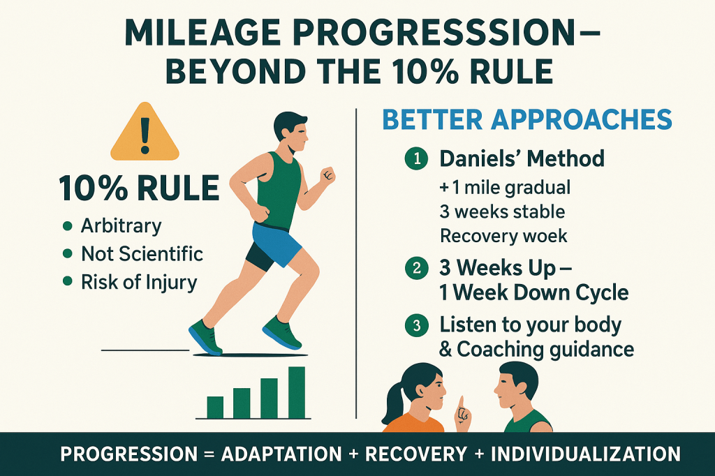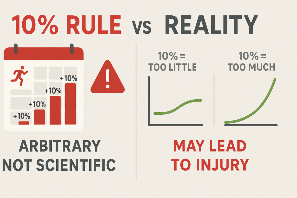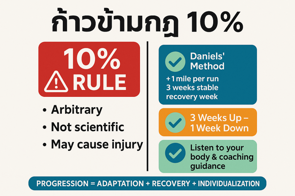 - ปัญหาของ “กฎ 10%” (The 10% Rule): แม้จะมีการกล่าวถึงอย่างแพร่หลาย แต่กฎที่ว่าไม่ควรเพิ่มระยะทางรายสัปดาห์เกิน 10% นี้ไม่มีหลักฐานทางวิทยาศาสตร์สนับสนุน และอาจน้อยเกินไปสำหรับนักวิ่งที่วิ่งน้อย และมากเกินไปสำหรับนักวิ่งที่วิ่งมาก