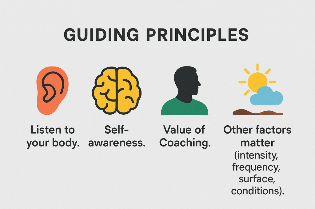 3. การเริ่มต้นด้วยความสม่ำเสมอ ไม่ใช่ระยะทาง (Start with Consistency, Not Mileage) ความสม่ำเสมอเป็นปัจจัยที่สำคัญที่สุดในการพัฒนาระบบกล้ามเนื้อ กระดูก และหัวใจและหลอดเลือด เป้าหมายคือการสร้างนิสัยการวิ่ง โดยวิ่งอย่างน้อย 3-4 ครั้งต่อสัปดาห์ แต่ละครั้งอย่างน้อย 30 นาที ก่อนที่จะพยายามเพิ่มปริมาณการวิ่ง สำหรับนักวิ่งที่เพิ่งเริ่มต้นหรือกลับมาวิ่งใหม่ แผนการฝึก 6 สัปดาห์อาจเน้นการเดิน/วิ่ง (Run/Walk) ก่อน และควรมุ่งเน้นไปที่เวลาในการวิ่งมากกว่าระยะทาง เพื่อหลีกเลี่ยงการสร้างความเครียดให้ร่างกายมากเกินไป