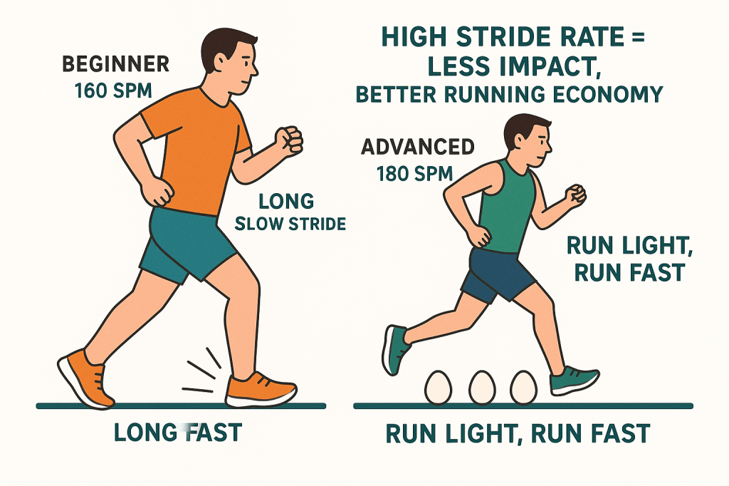 • อัตราก้าว (Stride Rate) ที่สูง: นักวิ่งควรตั้งเป้าหมายที่อัตราก้าว 180 ก้าวต่อนาทีขึ้นไป การฝึกก้าวสั้นๆ เบาๆ จะช่วยลดแรงกระแทกต่อระบบกล้ามเนื้อและกระดูก และปรับปรุงเศรษฐกิจการวิ่ง (running economy) สิ่งนี้ช่วยสร้าง “โครงสร้าง” ที่แข็งแกร่งและมีประสิทธิภาพก่อนที่จะเพิ่มการฝึกที่เร็วและเข้มข้นขึ้น
