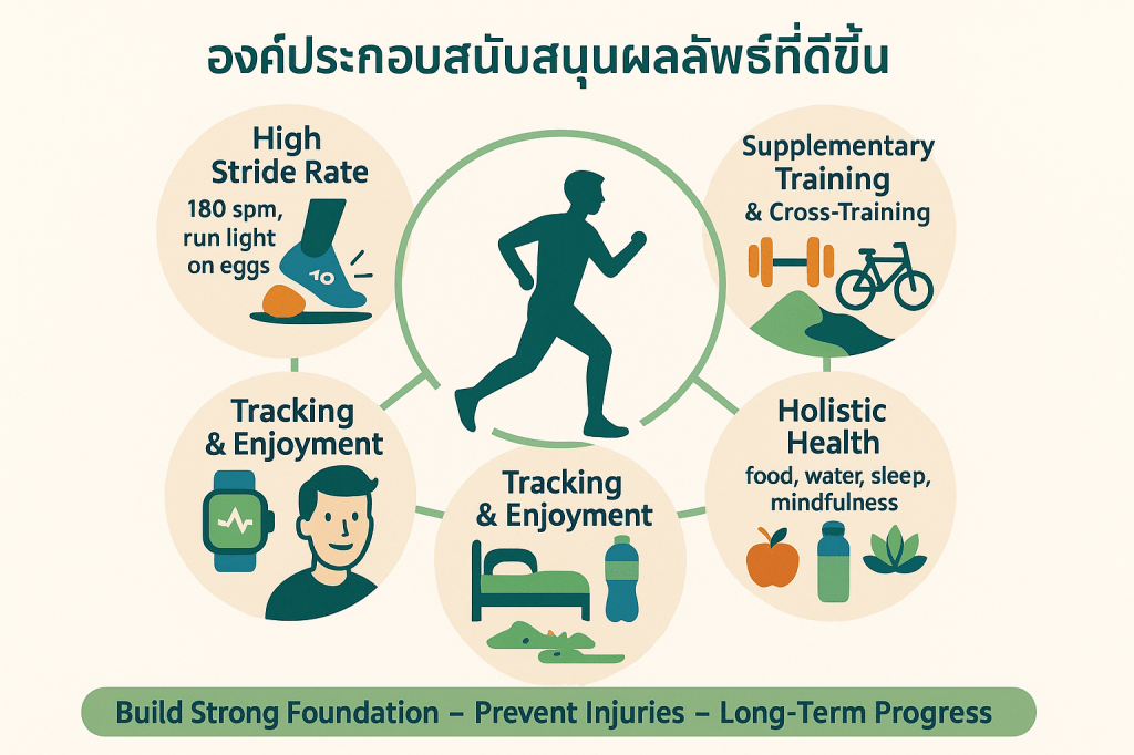 - การออกกำลังกายเสริม (Supportive Work): การเสริมการวิ่งด้วยการยืดกล้ามเนื้อ การสร้างความแข็งแรงของแกนกลางลำตัว และการฝึกความแข็งแรงเป็นประจำ เพื่อรักษารูปแบบการวิ่งที่ดีและลดความเสี่ยงต่อการบาดเจ็บ