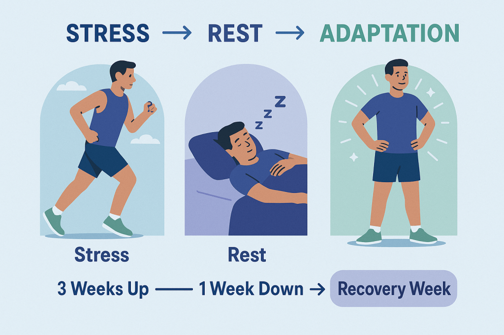 - วงจรความเครียด-พัก-ปรับตัว: กระบวนการที่ทำให้ร่างกายแข็งแรงขึ้นเกี่ยวข้องกับวงจรของความเครียด ตามด้วยการพัก ซึ่งเป็นช่วงเวลาที่ร่างกายจะตอบสนองและปรับตัวต่อปริมาณการฝึก หากนักวิ่งไม่ให้ความสำคัญกับการพัก ร่างกายจะไม่สามารถปรับตัวได้เต็มที่ นำไปสู่ความคืบหน้าที่หยุดชะงัก การหมดไฟ หรือการบาดเจ็บ