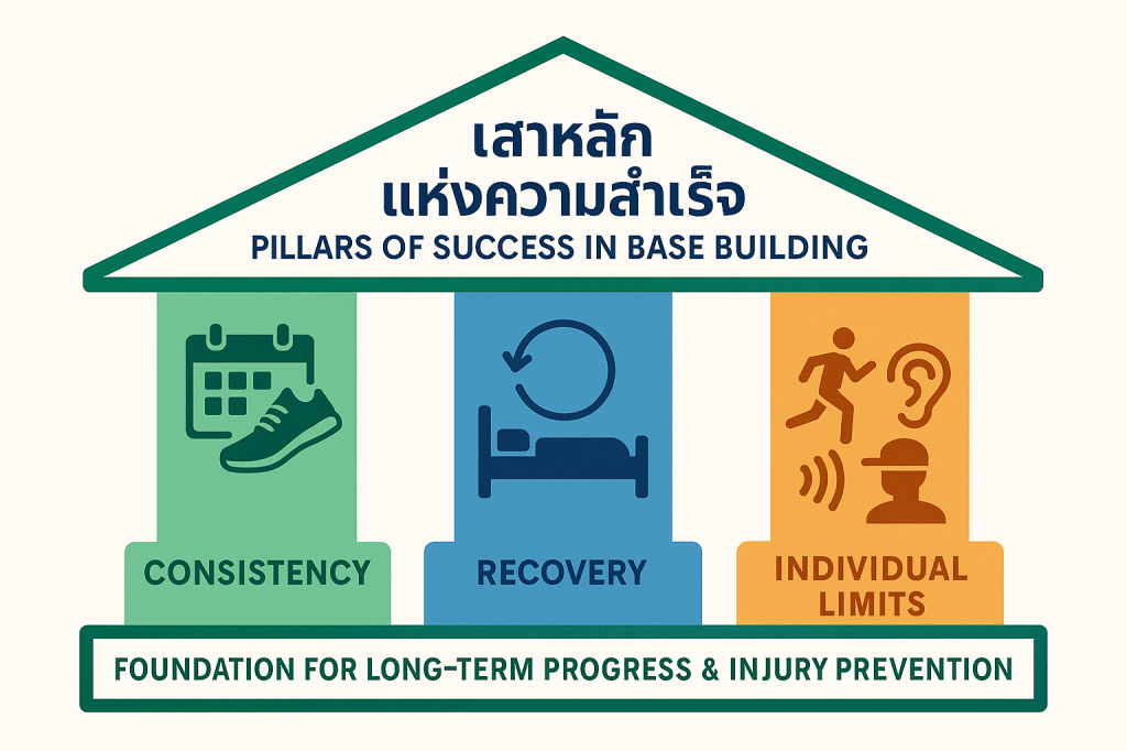 ในการสร้างฐานการวิ่ง (Base Building) ซึ่งเป็นช่วงสำคัญที่สุดในการฝึกของนักวิ่ง เพื่อเตรียมร่างกายสำหรับการฝึกซ้อมที่เข้มข้นขึ้น การทำความเข้าใจและยึดมั่นใน “เสาหลักแห่งความสำเร็จ” ได้แก่ ความสม่ำเสมอ การฟื้นตัว และการตระหนักถึงขีดจำกัดส่วนบุคคล เป็นสิ่งจำเป็นอย่างยิ่งสำหรับการพัฒนาในระยะยาว การป้องกันการบาดเจ็บ และการบรรลุเป้าหมายการวิ่ง