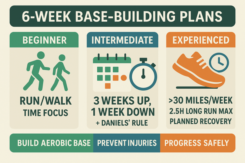 ตารางการฝึกซ้อมวิ่ง 6 สัปดาห์ในบริบทที่กว้างขึ้นของหลักการสร้างฐานการวิ่ง (Base Building) โดยตารางเหล่านี้ถูกออกแบบมาเพื่อนำหลักปรัชญาหลักของการสร้างฐานไปปฏิบัติจริง เพื่อสร้างรากฐานแอโรบิกที่แข็งแกร่งและป้องกันการบาดเจ็บ