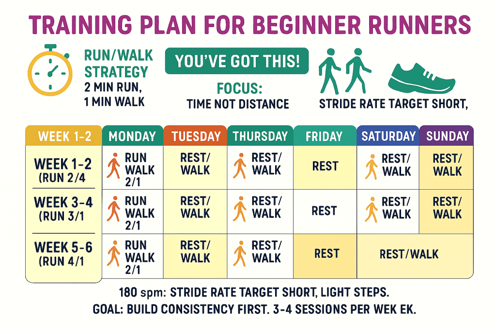 - เป้าหมาย: แผนนี้สำหรับนักวิ่งใหม่หรือผู้ที่กลับมาจากการพักยาว โดยเน้นการสร้างนิสัยการวิ่งและเพิ่มเวลาในการวิ่งอย่างค่อยเป็นค่อยไป