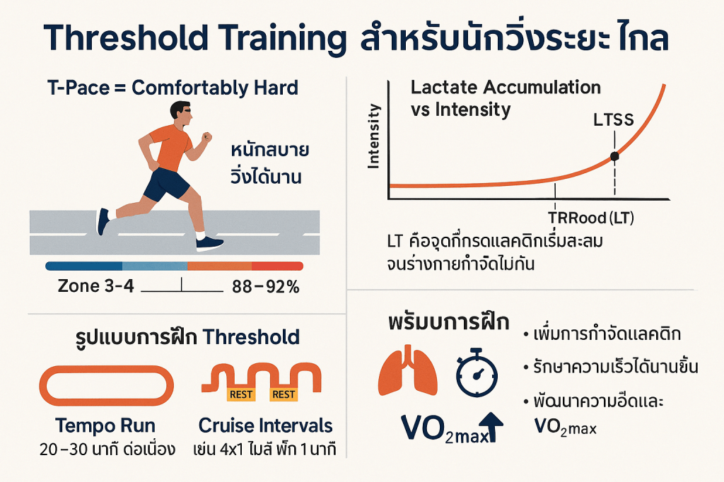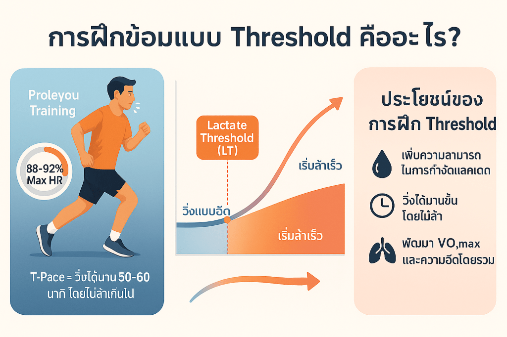 - ซ้อม Threshold ไม่ใช่การวิ่งให้เร็วสุด แต่คือการวิ่งที่ “หนักกำลังดี” เพื่อเพิ่มความสามารถร่างกายในการจัดการแลคติก ทำให้วิ่งเร็วได้นานขึ้น