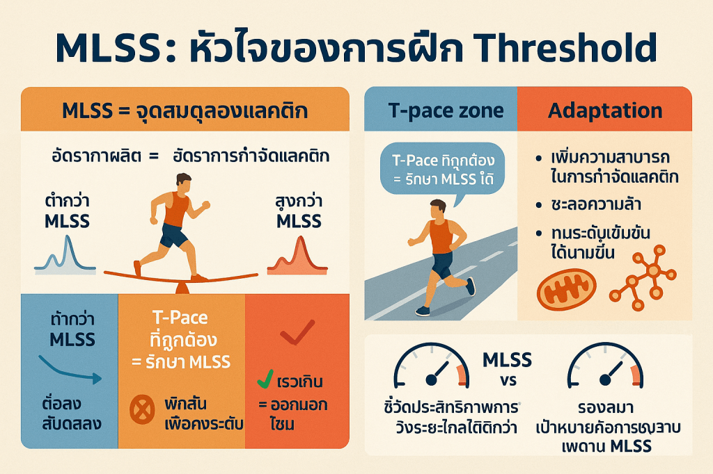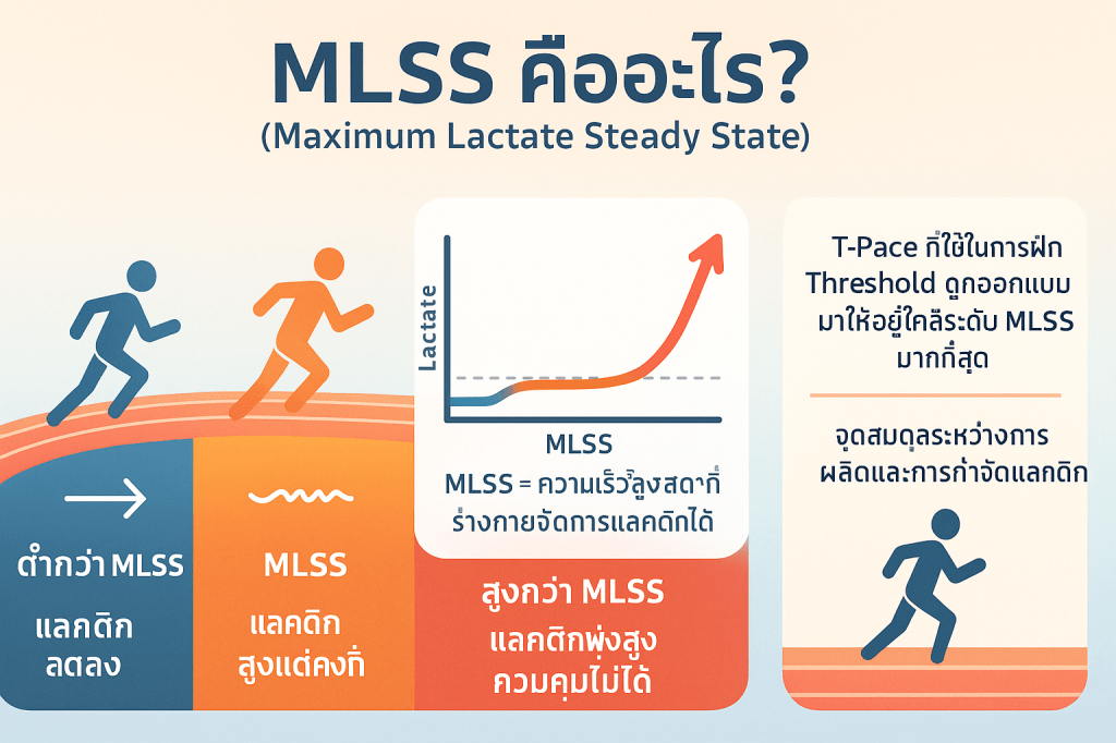 - ต่ำกว่า MLSS: หากวิ่งช้ากว่าระดับนี้ อัตราการกำจัดแลคติกจะสูงกว่าอัตราการผลิต ทำให้ระดับแลคติกในเลือดค่อยๆ ลดลง.