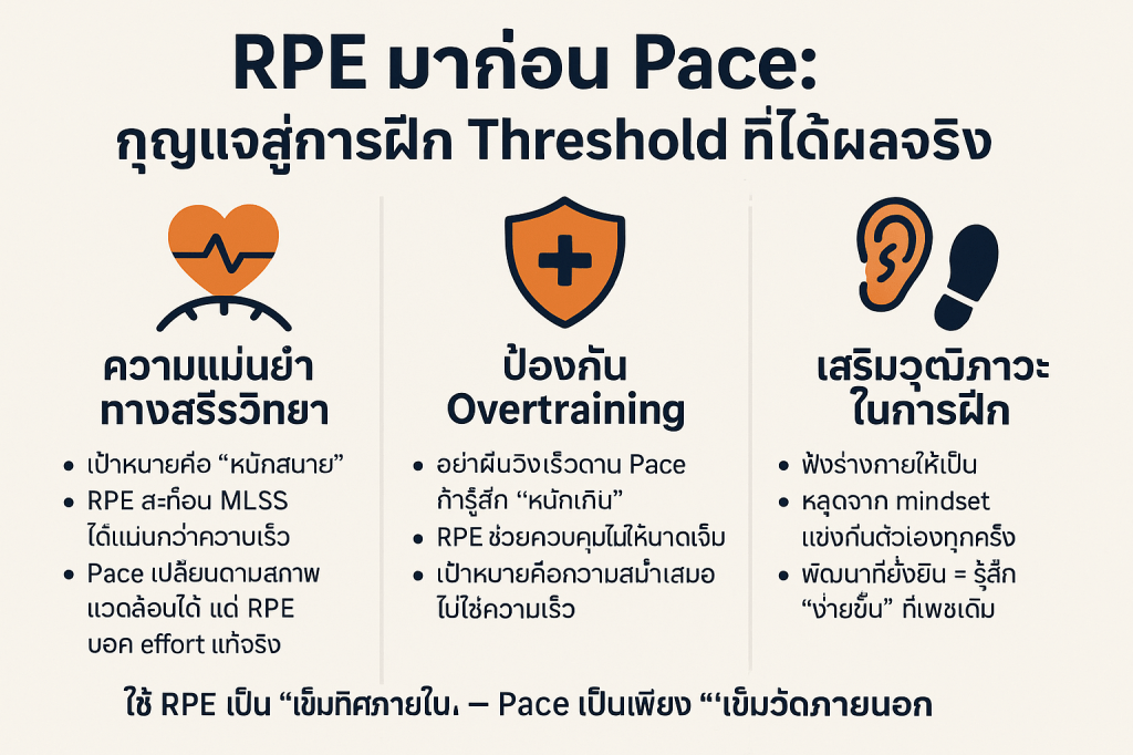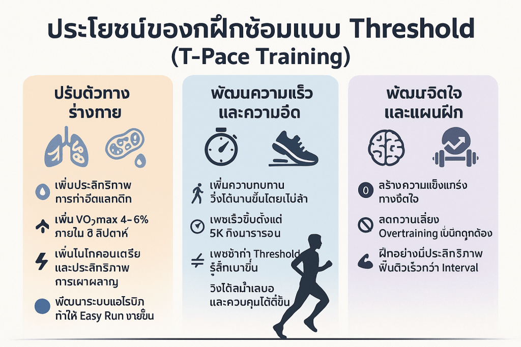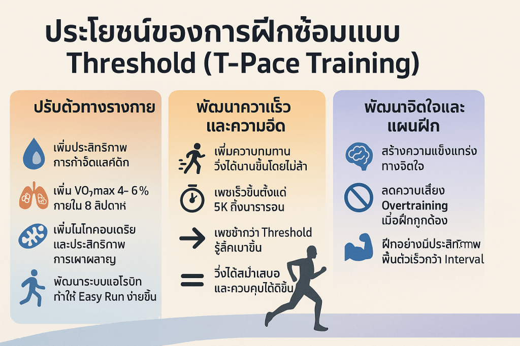 โดยสรุป เป้าหมายของการฝึกซ้อมแบบ Threshold Training คือการใช้ความเร็ว T-Pace ที่ “หนักสบาย” เพื่อกระตุ้นให้ร่างกายพัฒนากลไกการกำจัดแลคติกให้ดีขึ้น ซึ่งจะส่งผลโดยตรงต่อการเพิ่มความทนทานทางกายภาพและจิตใจ ทำให้สามารถวิ่งได้เร็วขึ้นและนานขึ้นในการแข่งขัน โดยทั้งหมดนี้อยู่ภายใต้กรอบการฝึกที่ควบคุมความเสี่ยงจากการบาดเจ็บและการฝึกที่หนักเกินไป