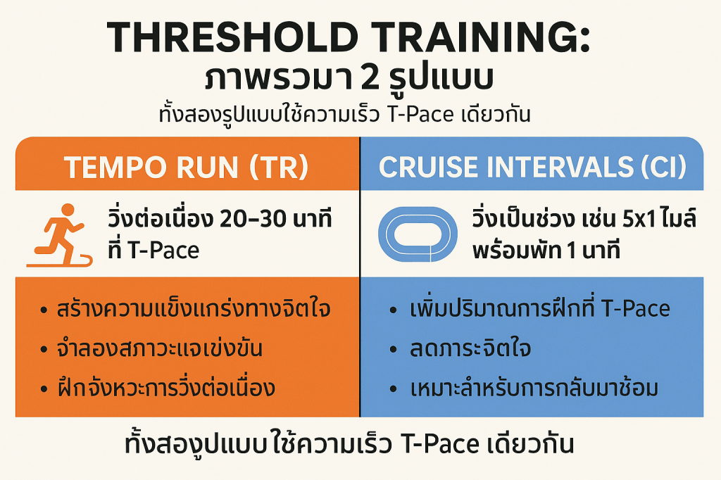 - รูปแบบการฝึก: การฝึกซ้อมแบบ Threshold มี 2 รูปแบบหลัก คือ Tempo Runs (การวิ่งต่อเนื่อง) และ Cruise Intervals (การวิ่งเป็นรอบๆ โดยมีช่วงพักสั้นๆ) ทั้งสองรูปแบบนี้จะใช้ความเร็วเท่ากันคือ T-Pace
