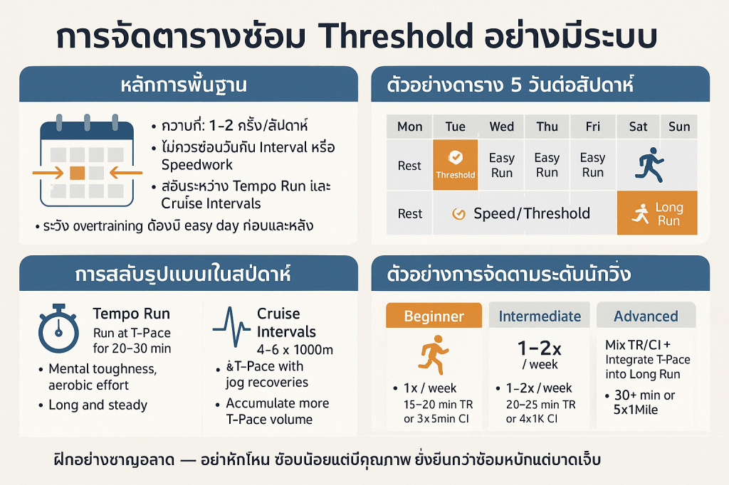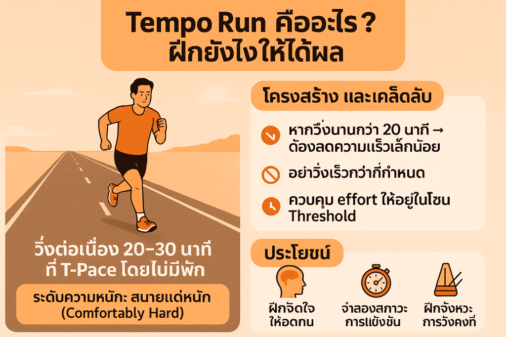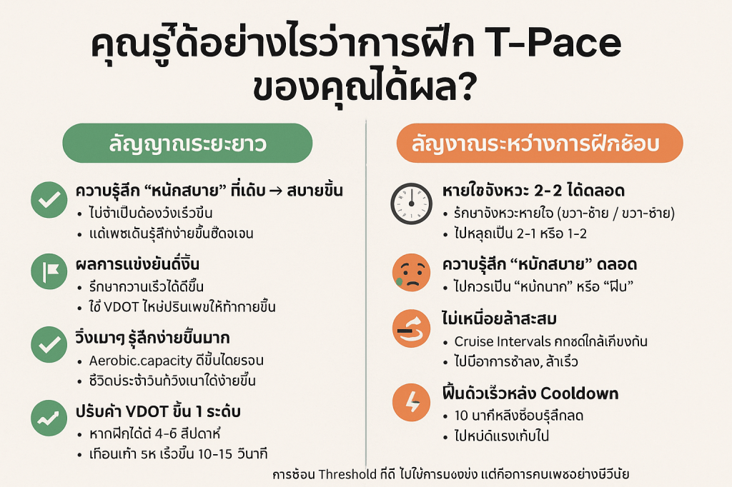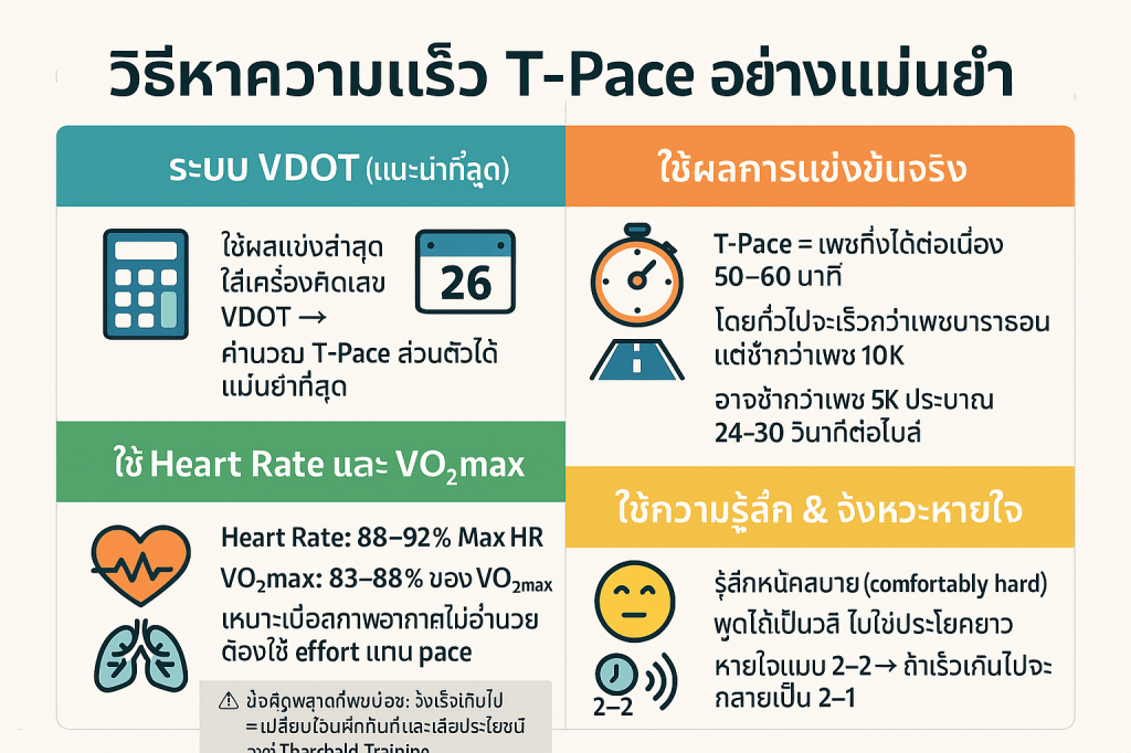 - กฎทอง: T-Pace ไม่เกิน 10% ของระยะวิ่งต่อสัปดาห์ และไม่เกิน 16 กม./1 ชั่วโมง ต่อครั้ง เพื่อหลีกเลี่ยงการซ้อมหนักเกิน