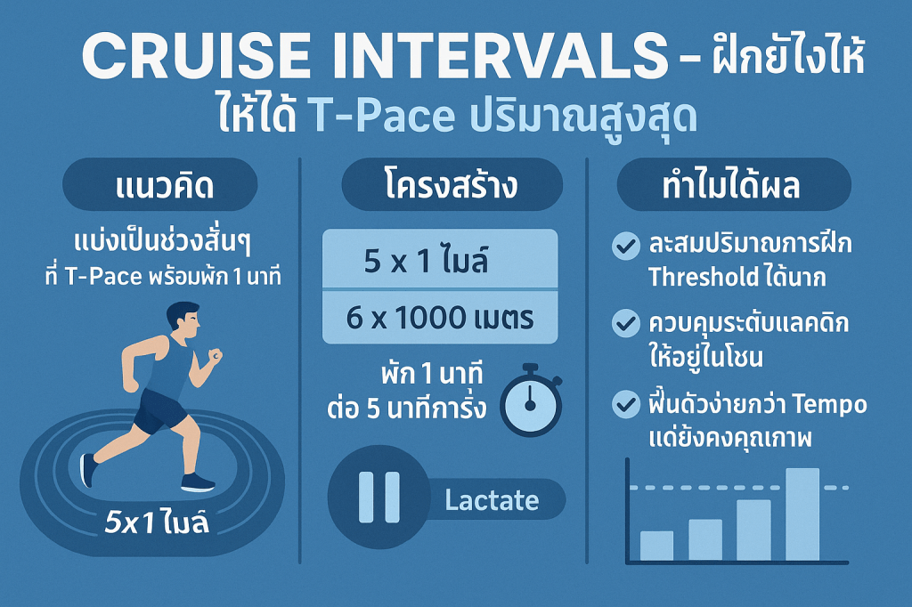- Cruise Intervals ให้ผลดีกว่า Tempo Run แบบต่อเนื่อง เพราะพักสั้นๆ ช่วยให้สะสมระยะในโซน T-Pace ได้มากขึ้นโดยไม่ล้าเกินไป