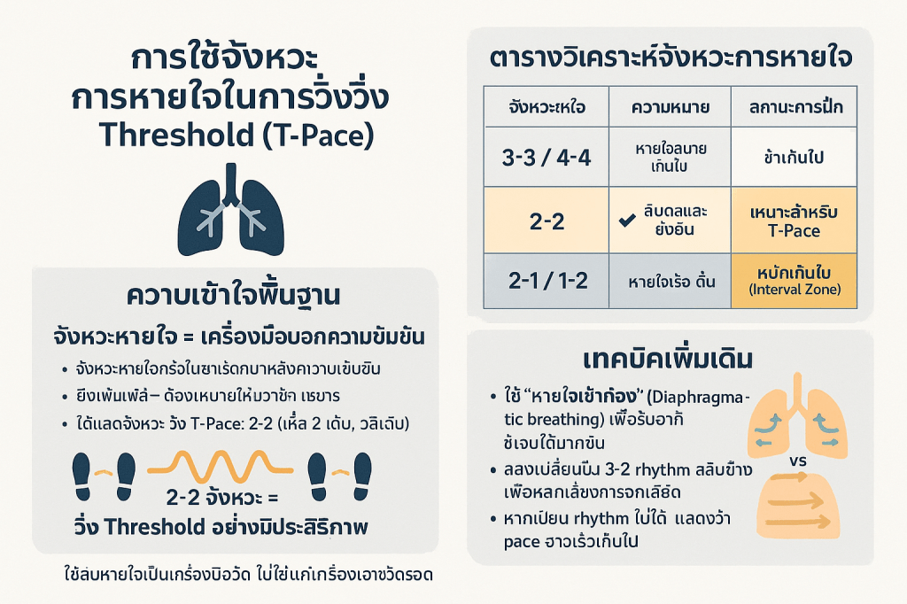 - ช้าเกินไป (Too Easy): หากสามารถหายใจในจังหวะ 3-3 หรือ 4-4 ได้อย่างสบาย แสดงว่าวิ่งช้าเกินไปสำหรับ T-Pace.