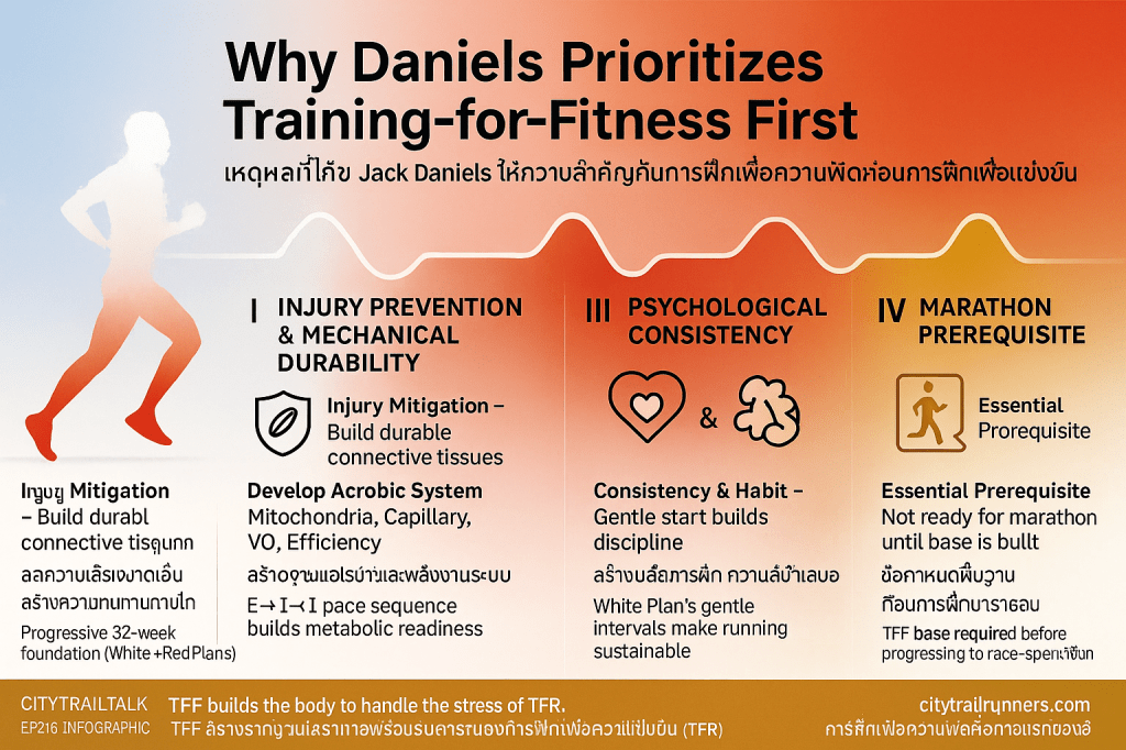- การลดความเสี่ยงการบาดเจ็บ: การเร่งเข้าสู่การเตรียมตัวเพื่อการแข่งขันโดยไม่มีฐานความฟิตที่มั่นคงจาก TFF อาจเพิ่มความเสี่ยงต่อการบาดเจ็บ