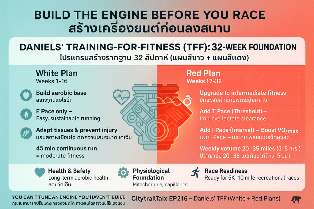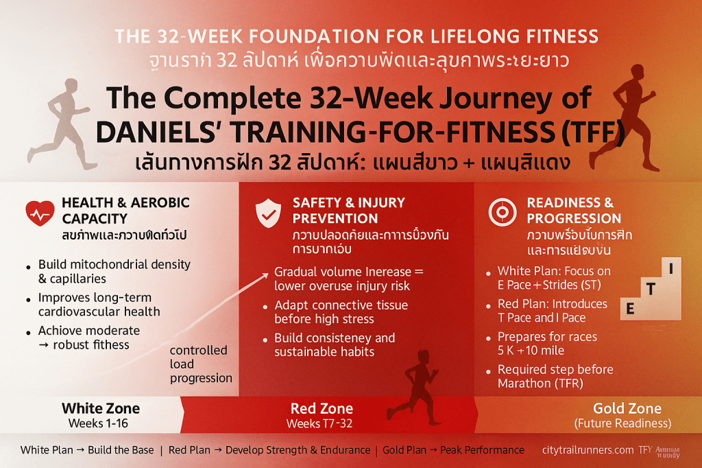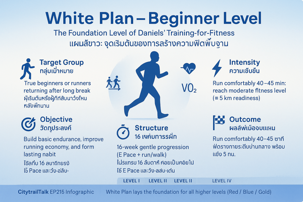 Daniels’ Training-for-Fitness (TFF) เป็นกรอบการฝึกซ้อมที่มุ่งเน้นการยกระดับความสามารถทางสรีรวิทยาพื้นฐาน (physiological proficiency) และส่งเสริมสุขภาพในระยะยาว แผนสีขาว (White Starting Plan) ถือเป็นระดับเริ่มต้น (Level I–IV) ของ TFF ซึ่งถูกออกแบบมาโดยมีวัตถุประสงค์และความเหมาะสมที่เฉพาะเจาะจงมาก