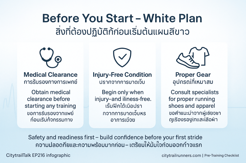 - ปราศจากการบาดเจ็บ: นักวิ่งต้องมั่นใจว่าตนเอง ปลอดจากการบาดเจ็บหรือความเจ็บป่วย ก่อนเริ่มโปรแกรม