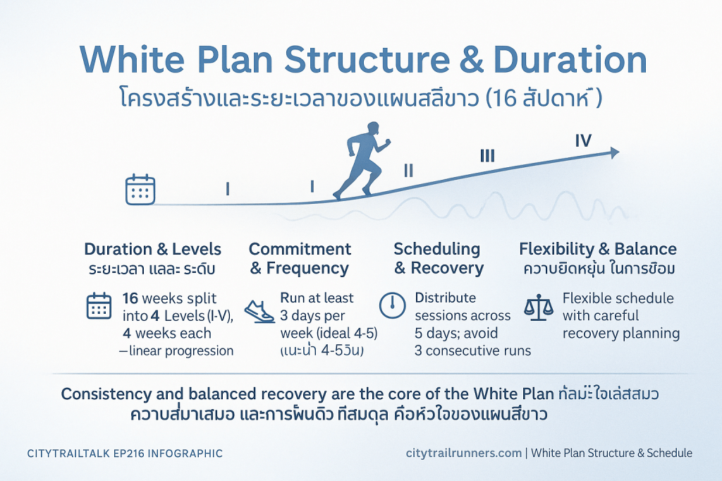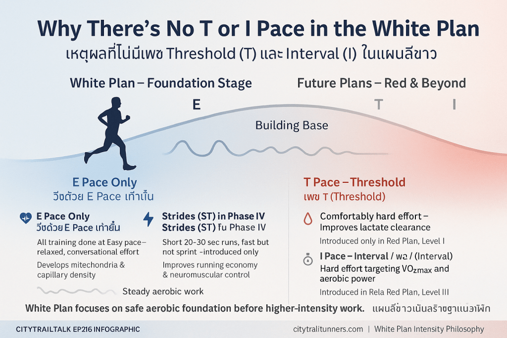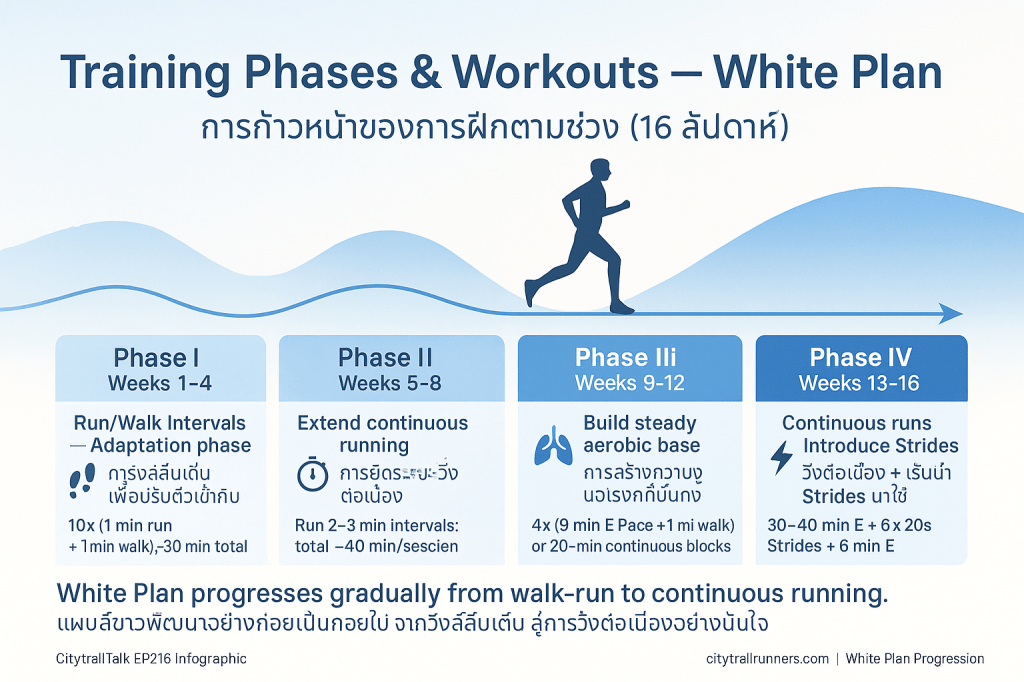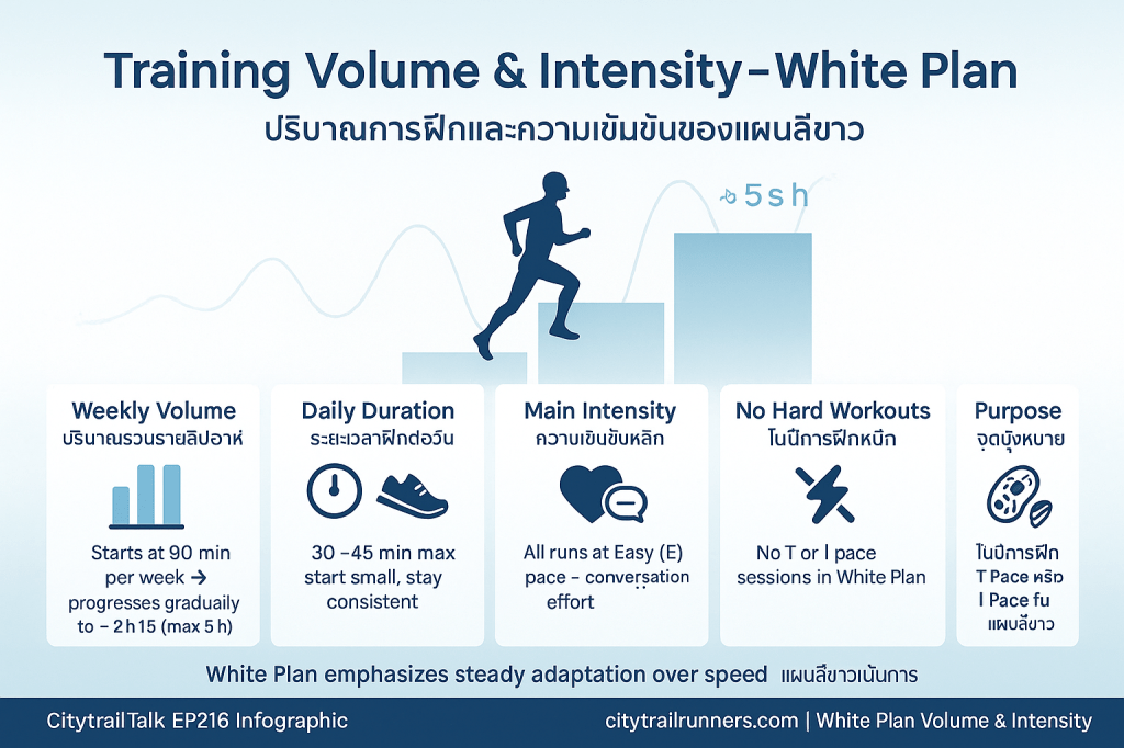 - เน้น E Pace เท่านั้น: ในแผนสีขาว การวิ่งทั้งหมด จะถูกจำกัดอย่างเคร่งครัดที่ E Pace หรือการวิ่งเบา