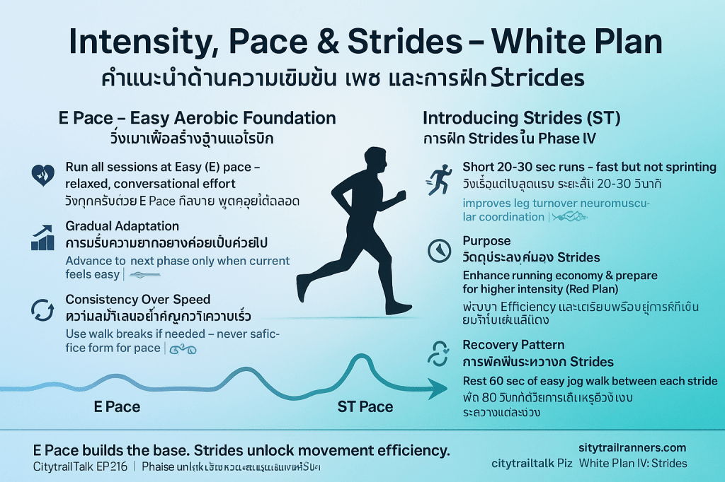 | ST (Strides) | การวิ่งเร็วสั้น ๆ 20–30 วินาที ไม่ใช่การสปรินต์ ตามด้วยการพัก 1 นาที | มีการใช้ Strides อย่างสม่ำเสมอใน Level I–IV ควบคู่ไปกับ E Pace เพื่อปรับปรุง Running Economy และจังหวะขา |