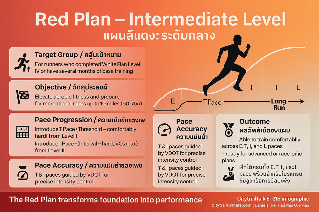 แผนสีแดง (Red Intermediate Plan) เป็นระดับที่สองของโปรแกรม Daniels’ Training-for-Fitness (TFF) โดยมีจุดมุ่งหมายหลักในการ ยกระดับความฟิตแบบแอโรบิก และเตรียมพร้อมสำหรับการแข่งขันสันทนาการระยะปานกลาง (สูงสุดประมาณ 10 ไมล์) การจัดการความเข้มข้นในแผนสีแดงจึงแตกต่างจากแผนสีขาวอย่างมาก เนื่องจากเป็นการเปลี่ยนผ่านจากการวิ่งเบา (Easy running) ไปสู่การฝึกคุณภาพที่มีโครงสร้าง (structured hard workouts)