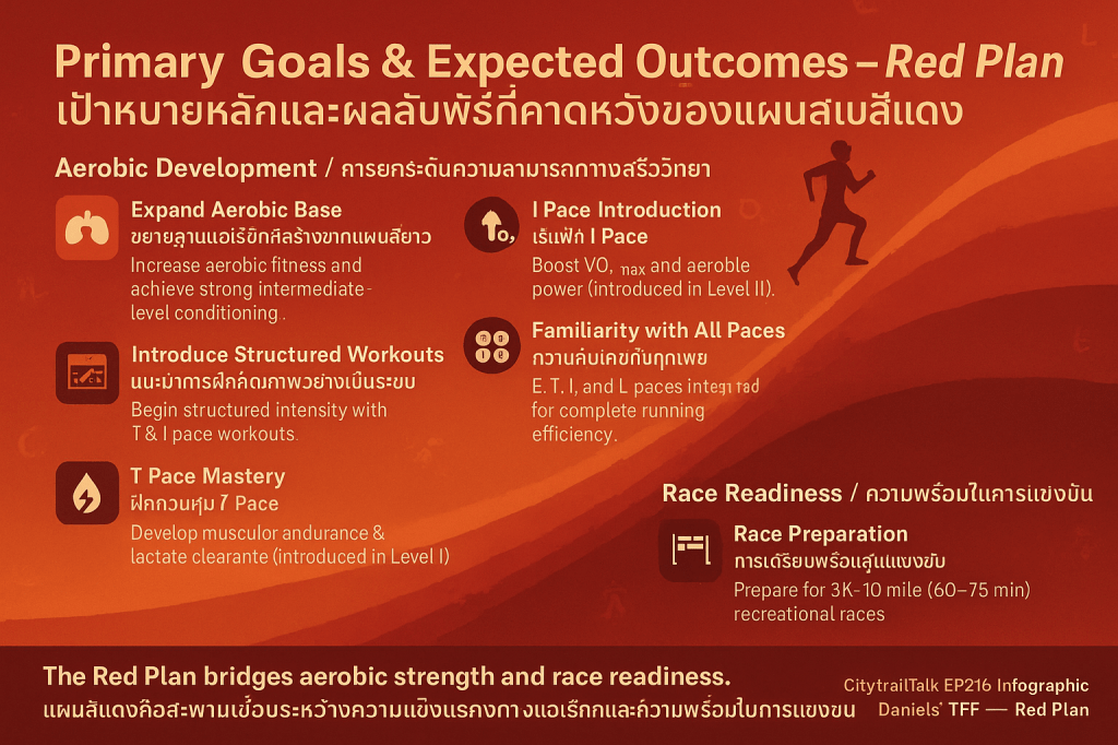 โดยสรุป โครงสร้างและการฝึกของแผนสีแดงทำหน้าที่เป็นสะพานเชื่อมที่มีความสำคัญ โดยนำนักวิ่งออกจากเขตความสบายของการวิ่งเบา (E pace) ไปสู่การฝึกที่ต้องใช้ความแม่นยำของความเร็ว (T และ I pace) และเพิ่มปริมาณการวิ่งอย่างมีนัยสำคัญ เพื่อให้บรรลุความฟิตระดับกลางที่แข็งแกร่งและมีความทนทานต่อการแข่งขันมากขึ้น