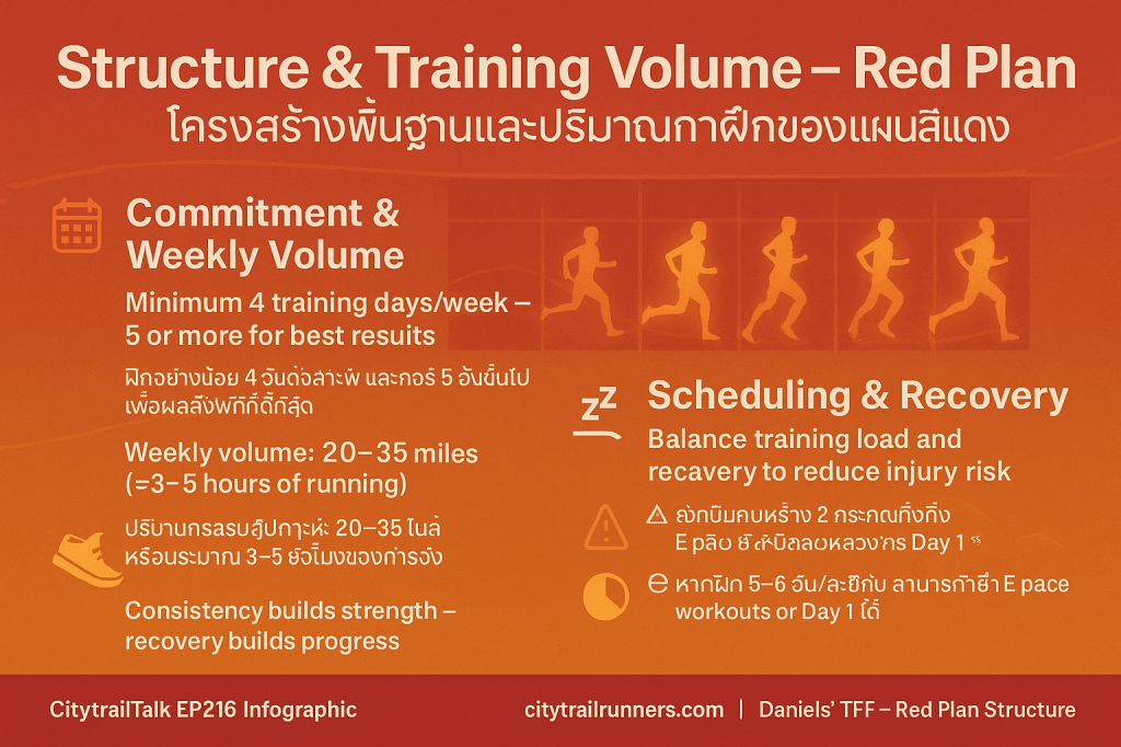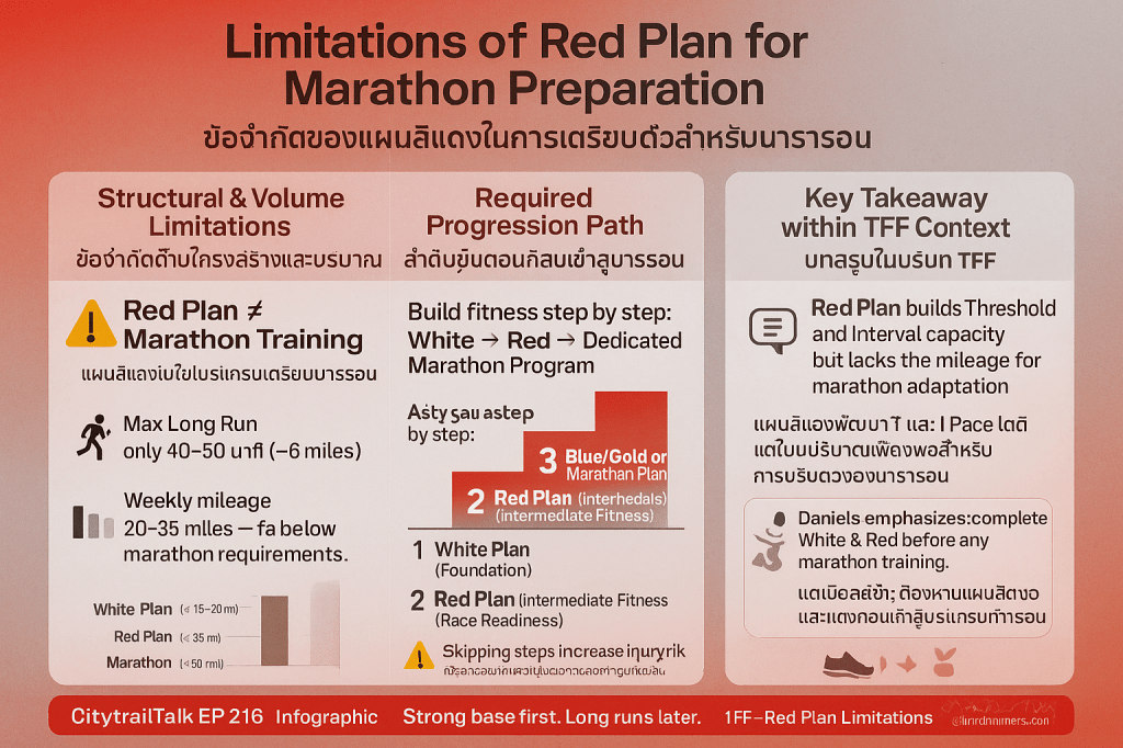 - ฐานรากไม่เพียงพอ: แหล่งข้อมูลระบุอย่างชัดเจนว่า ปริมาณการฝึกและความทนทานที่สร้างขึ้นในแผนสีแดง ไม่เพียงพออย่างยิ่ง ต่อการเตรียมตัวสำหรับการวิ่งมาราธอนอย่างปลอดภัย Long Run สูงสุดในแผนสีแดง (40–50 นาที หรือ 6 ไมล์) ยังห่างไกลจากความต้องการทางสรีรวิทยาของมาราธอน