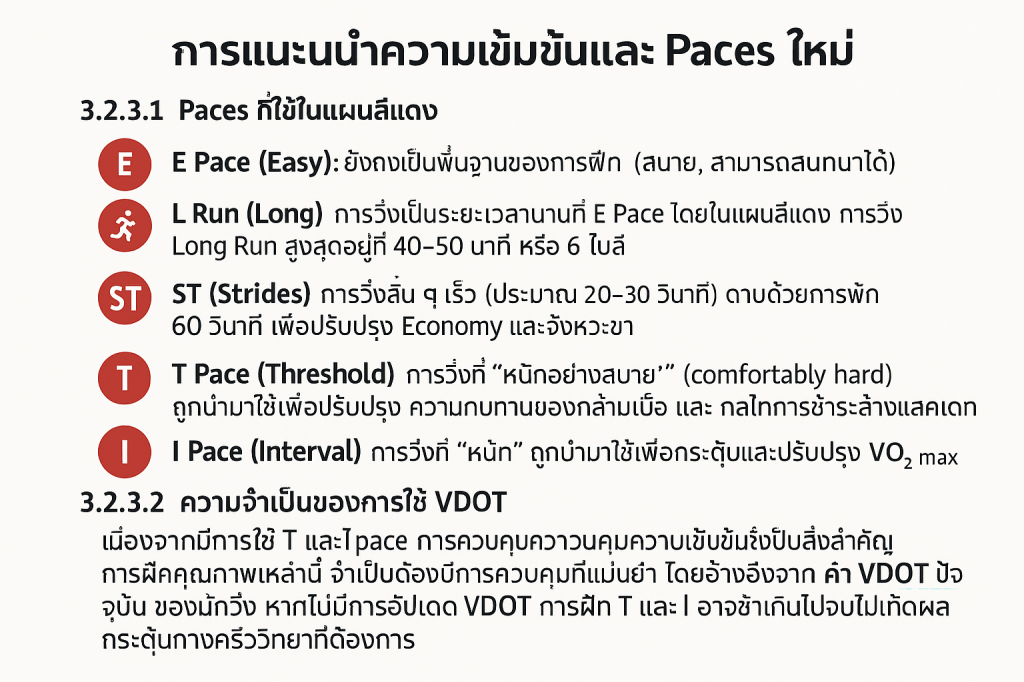 - การอ้างอิง VDOT: การฝึกคุณภาพ T Pace และ I Pace ในแผนสีแดงจำเป็นต้องอ้างอิงจาก คะแนน VDOT ปัจจุบัน ของนักวิ่ง VDOT คือหน่วยวัดสมรรถภาพการวิ่งที่เทียบเท่ากับ VO_2 max ซึ่งใช้ในการกำหนดความเร็วที่ถูกต้องตามหลักสรีรวิทยา