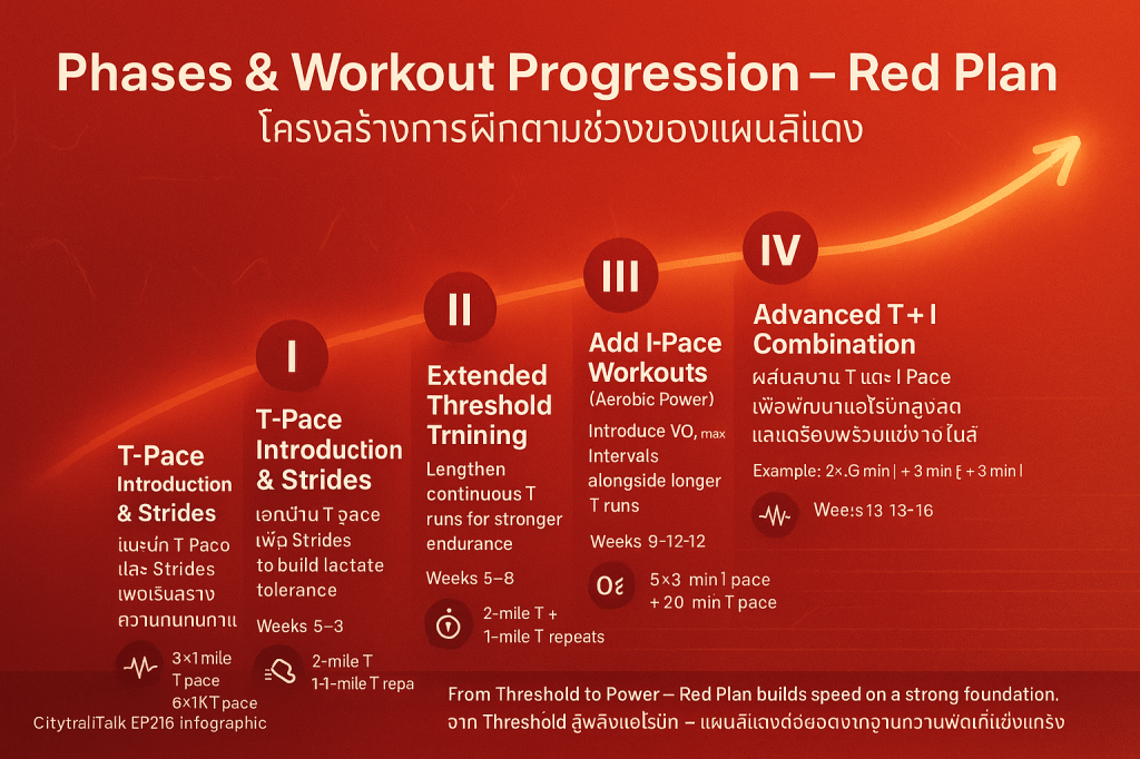 - การแนะนำ T Pace (Threshold): แผนสีแดงเริ่มนำ T Pace เข้ามาใช้อย่างเป็นระบบตั้งแต่ Level I (สัปดาห์ที่ 1–4) เพื่อมุ่งเป้าไปที่การปรับปรุง Lactate Threshold