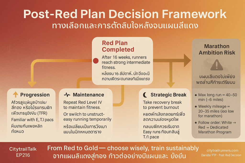 การตัดสินใจหลังจบแผนสีแดงจึงขึ้นอยู่กับว่านักวิ่งต้องการความท้าทายที่มากขึ้น (Progression) หรือต้องการรักษาระดับความฟิตปัจจุบันไว้ (Maintenance/Break)