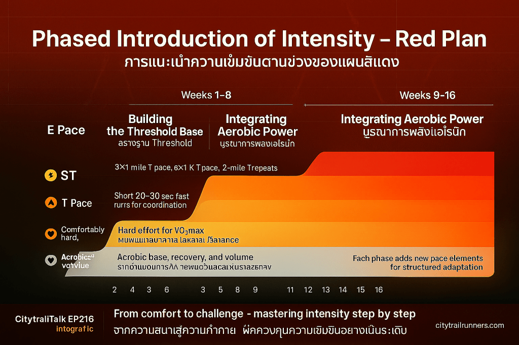 การจัดการความเข้มข้นในแผนสีแดงเน้นการนำความเร็วสามประเภทหลักมาใช้ ได้แก่ Easy (E), Threshold (T), และ Interval (I) อย่างเป็นระบบ ตลอดระยะเวลา 16 สัปดาห์