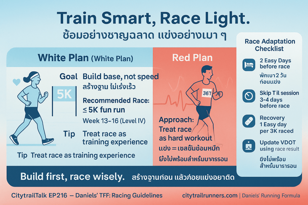 - ความแม่นยำของ Pace: การใช้ T และ I pace ในแผนสีแดงจำเป็นต้องมีการควบคุมความเข้มข้นอย่างแม่นยำตามค่า VDOT (ระดับความฟิตปัจจุบัน) ซึ่งเป็นสิ่งที่แผนสีขาวไม่ได้เน้น