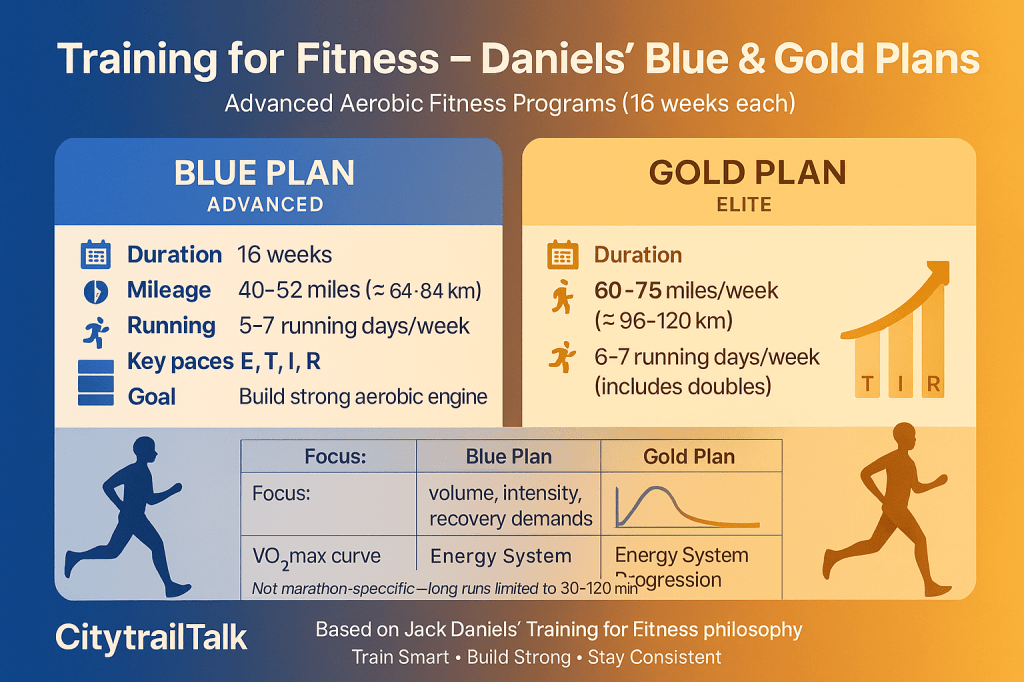 แผนการฝึกซ้อมเพื่อความฟิตขั้นสูง (Training for Fitness) ของ Jack Daniels โดยเน้นที่แผน Blue Advanced Plan และ Gold Elite Plan โดยเฉพาะ แผนการฝึกซ้อมความฟิตเหล่านี้มีจุดประสงค์เพื่อสร้างรากฐานแอโรบิกทั่วไปที่ยั่งยืนและแข็งแกร่ง ต่างจากการฝึกซ้อมเพื่อการแข่งขันโดยเฉพาะซึ่งมุ่งเป้าไปที่ผลลัพธ์ที่ดีที่สุดเพียงครั้งเดียว แผน Blue และ Gold แต่ละแผนมีระยะเวลา 16 สัปดาห์ โดยค่อยๆ เพิ่มความถี่และปริมาณการฝึกซ้อมขึ้นอย่างมาก (สูงถึง 75 ไมล์ต่อสัปดาห์ในแผน Gold) พร้อมทั้งนำเสนอจังหวะการฝึกซ้อมที่หลากหลาย (E, T, I, R) ตาม ค่า VDOT ของนักวิ่ง แม้ว่าแผนเหล่านี้จะนำไปสู่ความฟิตระดับสูง แต่เอกสารได้เน้นย้ำถึงข้อควรระวังที่สำคัญว่า นักวิ่งที่ต้องการวิ่งมาราธอนยังคงต้องเปลี่ยนไปใช้ โปรแกรมการฝึกซ้อมเพื่อการแข่งขัน (Training for Race) ที่เฉพาะเจาะจง เนื่องจากการวิ่งยาวในแผนความฟิตนั้นมีระยะเวลาจำกัด.