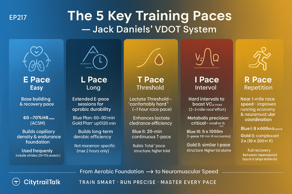 - E (Easy): Pace พื้นฐานที่ใช้สำหรับการฟื้นตัวและการสร้างความหนาแน่นของเส้นเลือดฝอย