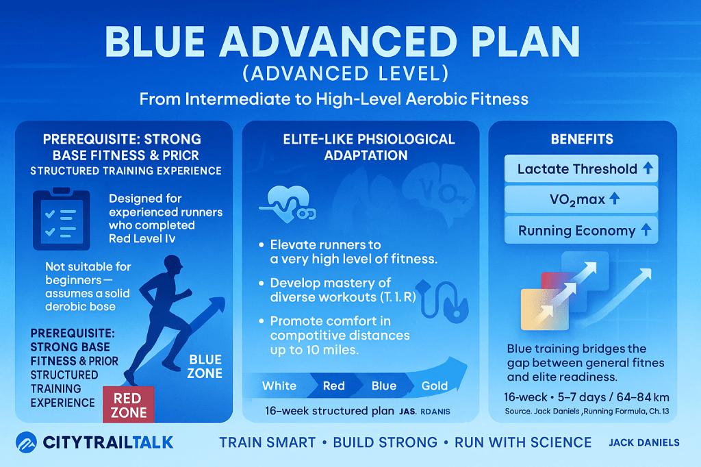 แผนฝึกความฟิตขั้นสูงสีน้ำเงิน (Blue Advanced Plan) ของ Jack Daniels เป็นขั้นตอนสำคัญที่ยกระดับนักวิ่งจากการฝึกระดับกลางไปสู่ระดับความสามารถทางแอโรบิกที่สูงมาก โดยมีวัตถุประสงค์เฉพาะเจาะจงที่เน้นการสร้างฐานความทนทานและความหลากหลายในการฝึกซ้อม