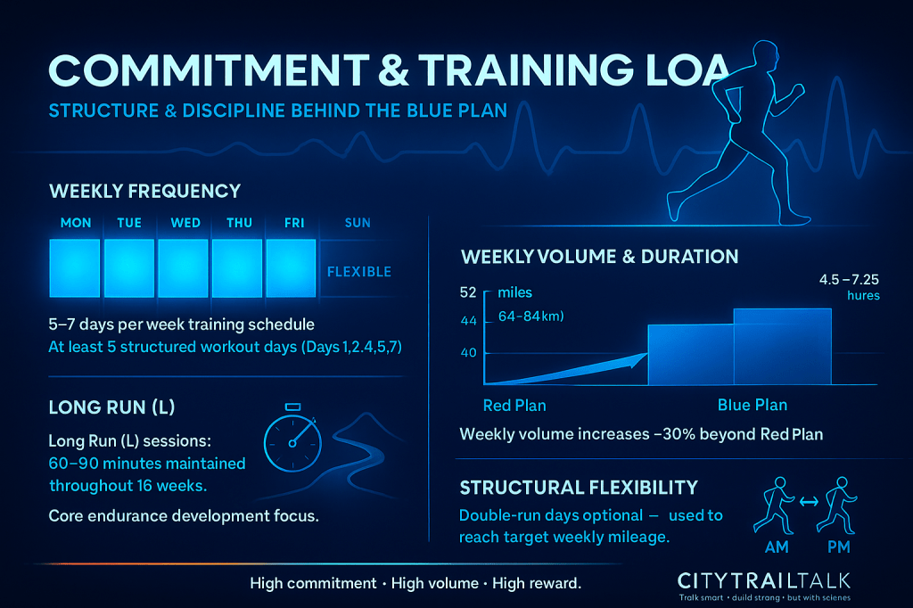 - ความมุ่งมั่น: เป็นแผน 16 สัปดาห์ ที่ต้องการการฝึก 6 หรือ 7 วันต่อสัปดาห์ โดยมีปริมาณงานสูงระหว่าง 60 ถึง 75 ไมล์ต่อสัปดาห์ และอาจต้องมีการวิ่งสองครั้งต่อวัน (double runs) เพื่อรองรับปริมาณงานที่สูง