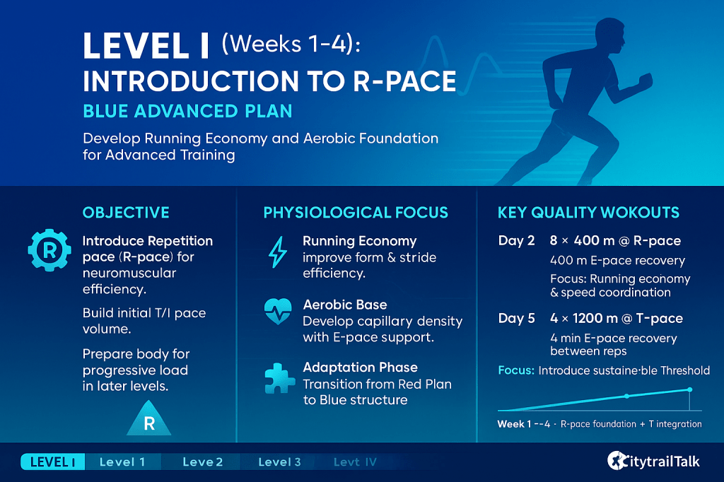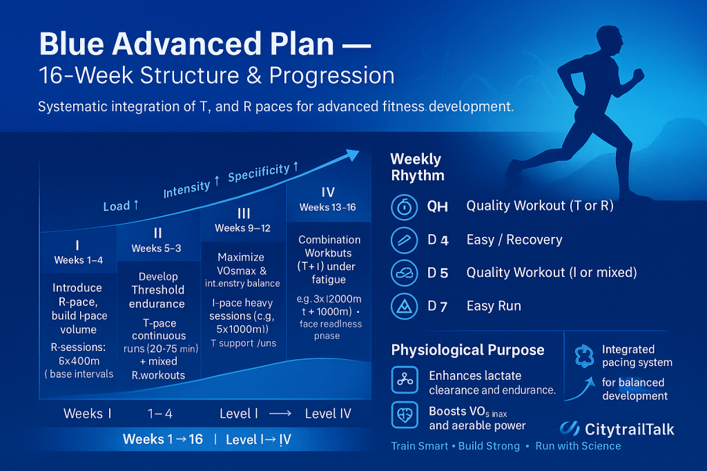 วัตถุประสงค์ของแผน Blue คือการสร้างความสามารถทางสรีรวิทยาในระดับสูง และเตรียมความพร้อมให้กับนักวิ่งสำหรับความท้าทายในการฝึกซ้อมที่ซับซ้อนขึ้น