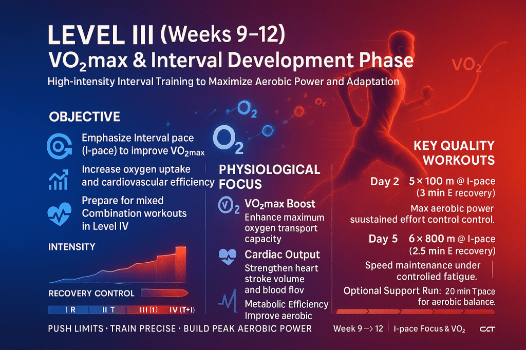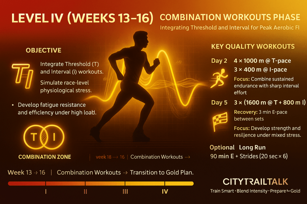 Workouts ใน Level IV ไม่ได้เน้นแค่ T-Pace เท่านั้น แต่ยังมีการรวม Workouts คุณภาพ (T, I, R) เข้าด้วยกันอย่างซับซ้อนภายในสัปดาห์ เพื่อเตรียมความพร้อมสำหรับการแข่งขัน