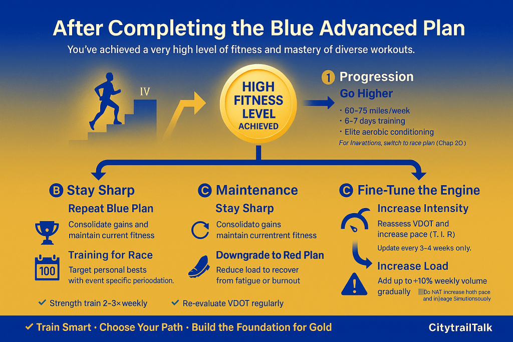 - ก้าวหน้าสู่ระดับถัดไป (Advancement): หากนักวิ่งจบแผน Blue Level IV ได้อย่างประสบความสำเร็จและแสดงให้เห็นถึงสุขภาพและความมุ่งมั่นที่สม่ำเสมอ และต้องการความท้าทายที่สูงขึ้น ก็ควรเปลี่ยนไปใช้แผน Gold Elite Plan หรือหากจบ Gold แล้วและต้องการความท้าทายต่อไป ก็สามารถเลือก Workouts ที่ยากขึ้นหรือสั้นลงได้