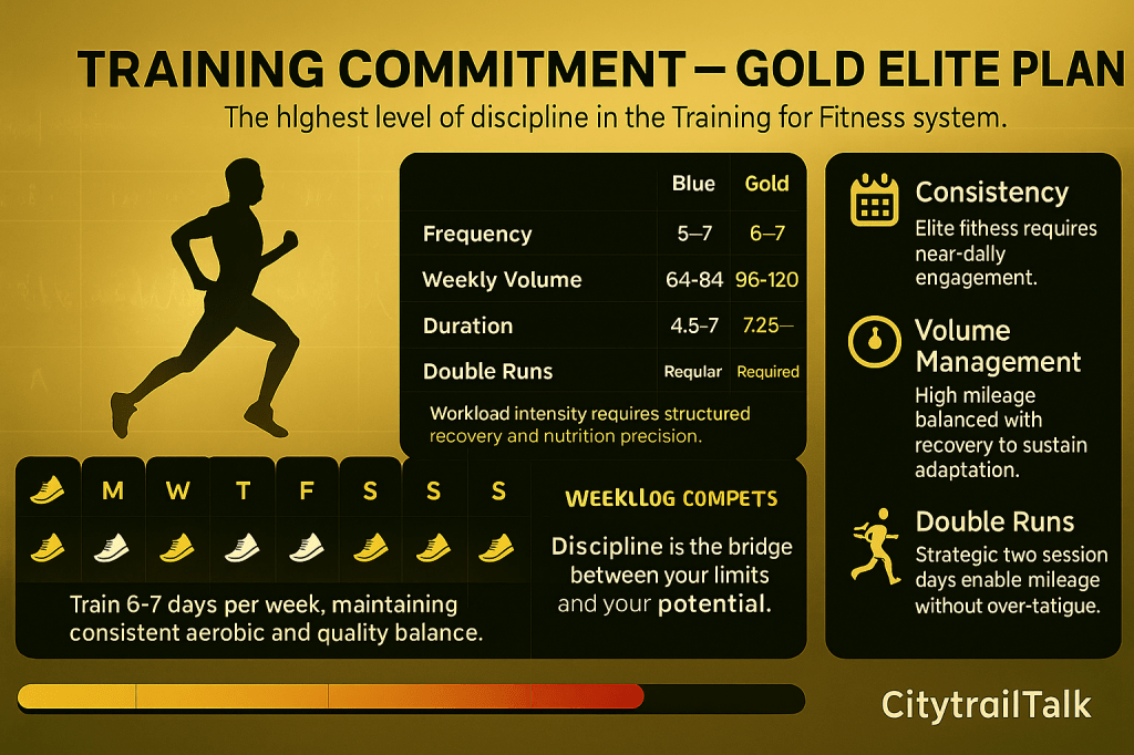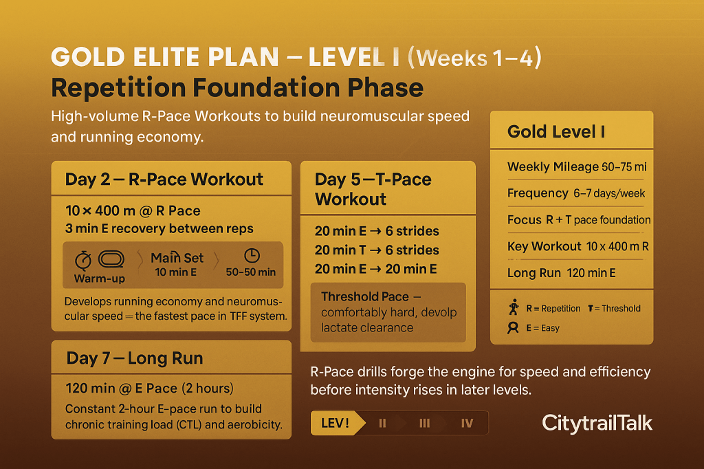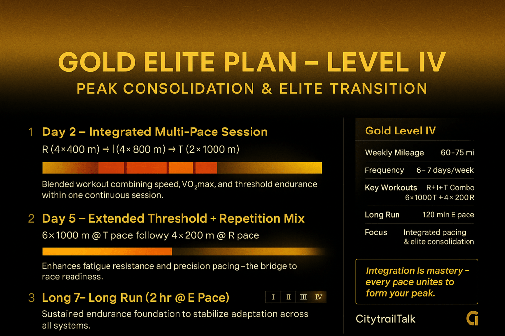 แผนฝึกความฟิตระดับยอดเยี่ยมสีทอง (Gold Elite Plan) Level IV (สัปดาห์ที่ 13–16) เป็นช่วงที่มีความเข้มข้นสูงสุดในระบบ Training for Fitness (TFF) โดย Workouts ในระดับนี้ถูกออกแบบมาเพื่อรวมความเครียด (Stressors) ทางสรีรวิทยาหลากหลายประเภทเข้าด้วยกัน ซึ่ง Workouts ที่เน้น T-Pace ปริมาณสูงสุด (Threshold Pace) เป็นองค์ประกอบสำคัญในการผลักดันขีดจำกัดความทนทานของนักวิ่ง
