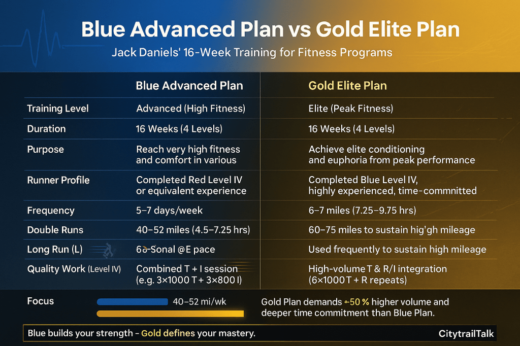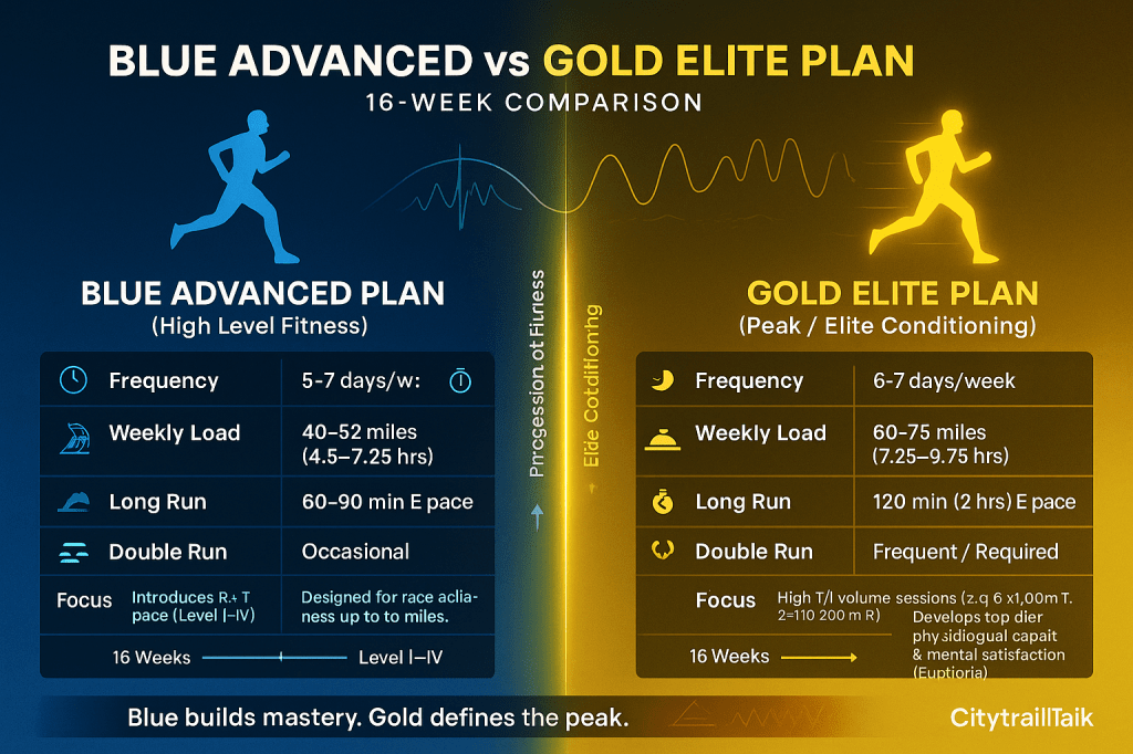 | ปริมาณงานและความเข้มข้น | ปริมาณงานปานกลางถึงสูง (Gold: 60–75 ไมล์/สัปดาห์) โดยมีความเข้มข้นที่หลากหลายแต่ไม่ถึงจุดสูงสุด | ปริมาณงานและความเข้มข้นที่สูงขึ้น (เช่น 70+ ไมล์) และความหนาแน่นของความเครียดสูงขึ้น |