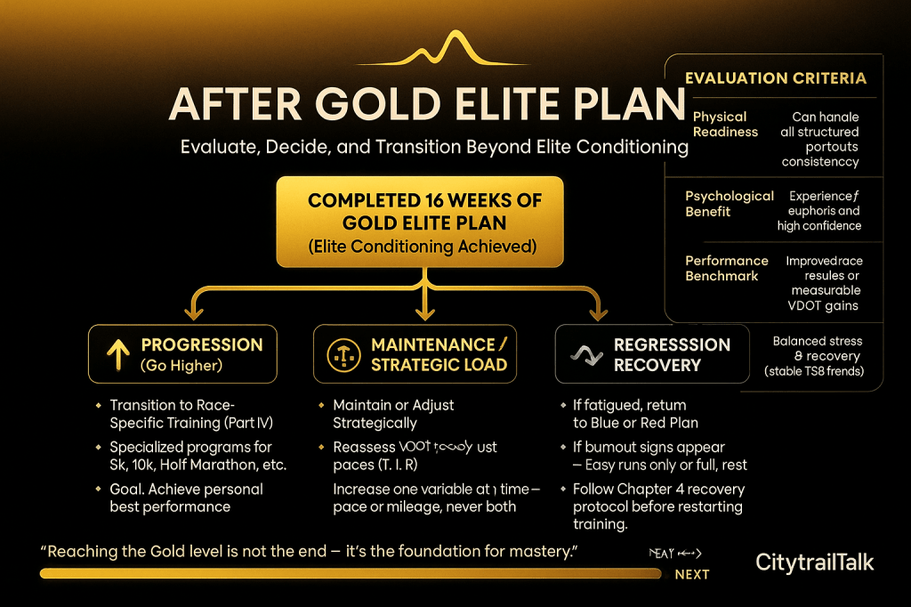 - เปลี่ยนไปสู่การฝึกเพื่อการแข่งขัน (Transition to Race, Part IV): หากนักวิ่งรู้สึกมีความฟิตสูงแต่มีเป้าหมายทำสถิติส่วนตัว (Personal Bests) ในระยะทางเฉพาะ ควรเปลี่ยนไปใช้โปรแกรมการฝึกเพื่อการแข่งขัน (Training for Race หรือ TFR) ที่อยู่ใน Part IV นักวิ่งที่จบ Gold Plan จะถือว่ามีฐานความฟิตที่แข็งแกร่งที่สุดและพร้อมรับมือกับการฝึกซ้อมที่มีประสิทธิภาพทุกประเภทที่เลือกทำต่อไป
