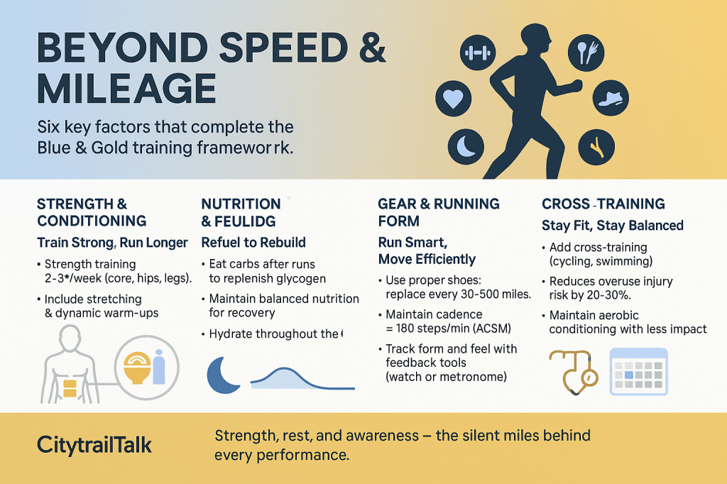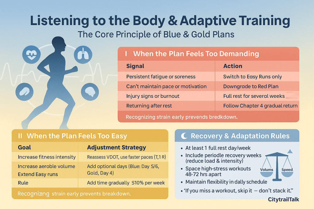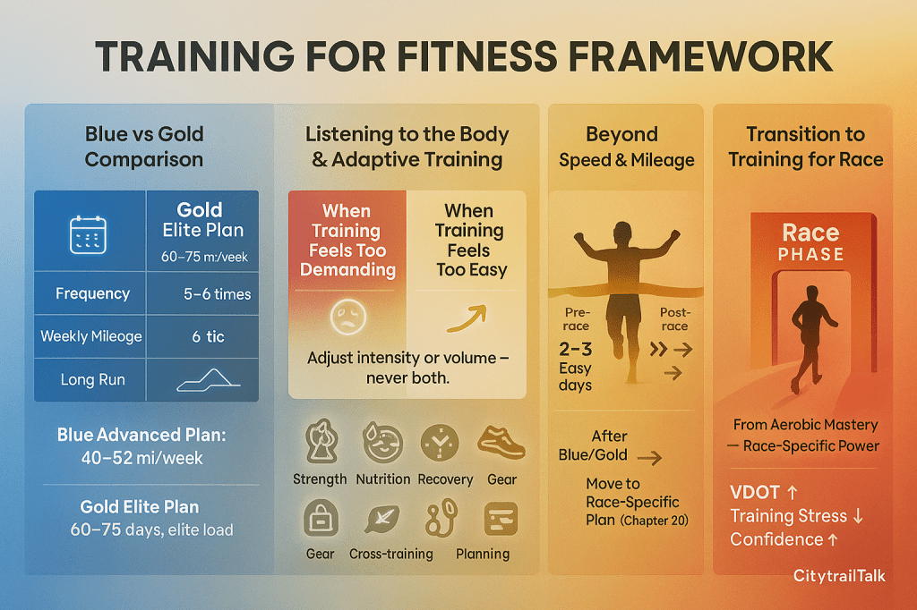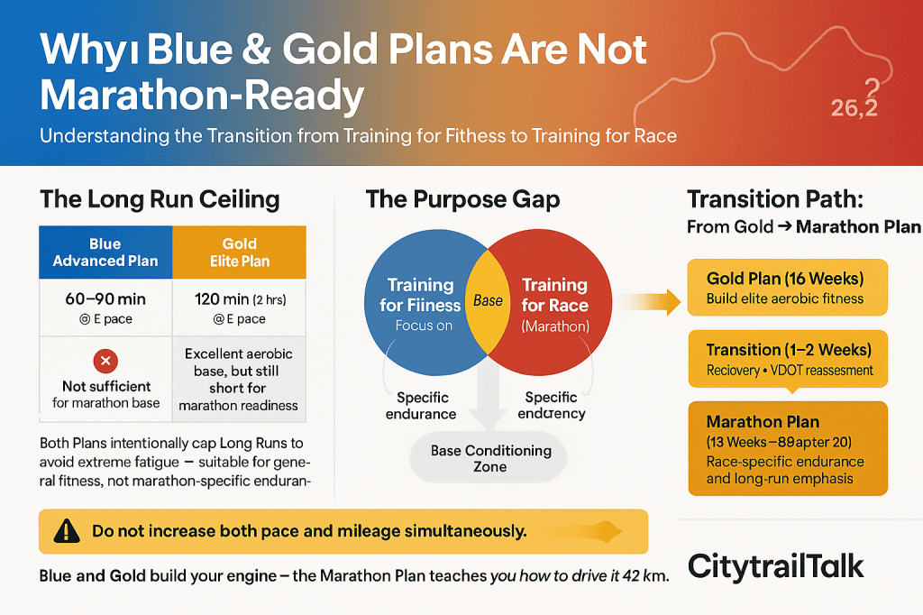 - การปรับตัวสำหรับการแข่งขัน (Racing Adaptation): หากนักวิ่งต้องการเข้าร่วมการแข่งขันในช่วงกลางแผน (Blue เหมาะสำหรับ 5K–10K; Gold เหมาะสำหรับระยะที่ไกลกว่านั้น) ต้องมีการปรับตัว:
