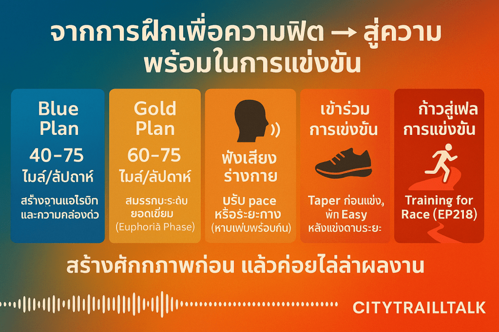 - การสร้างฐานรากสำหรับความก้าวหน้า: แผน TFF White -> Red -> Blue -> Gold ถูกออกแบบเป็นขั้นตอนต่อเนื่องเพื่อนำนักวิ่งไปสู่ระดับความเชี่ยวชาญที่เพิ่มขึ้น การจบแผน Blue หรือ Gold เป็นการสร้างรากฐานที่แข็งแกร่งและมีความสามารถทางสรีรวิทยาสูงกว่าคนทั่วไปอย่างมาก