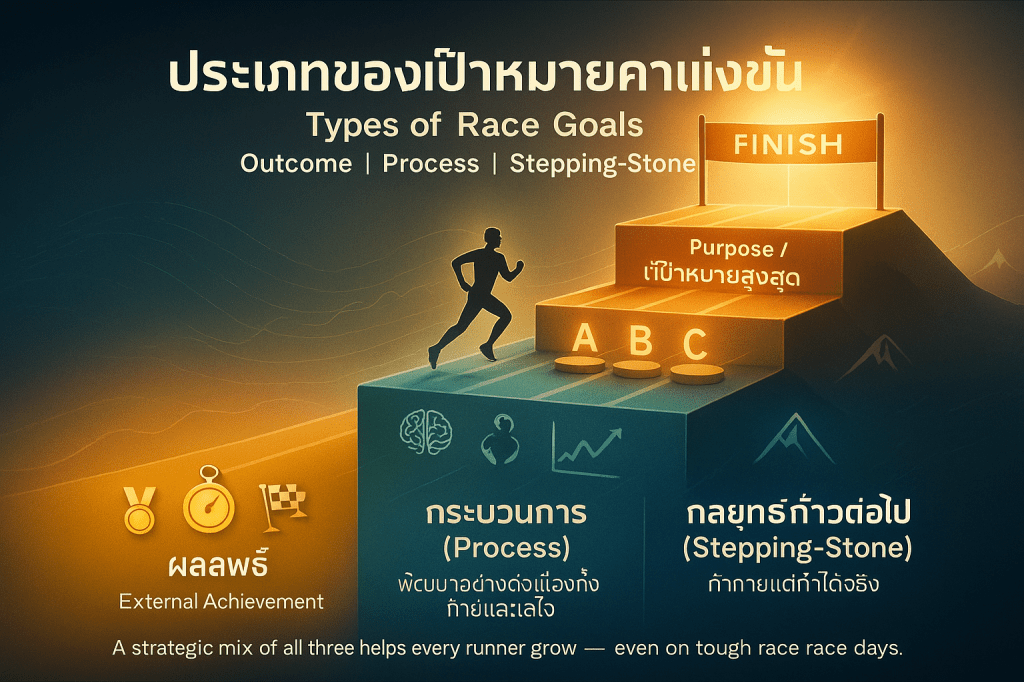 - สร้างความมั่นใจ: การเลือกเป้าหมายที่เหมาะสมจะช่วย เสริมสร้างความมั่นใจในความสามารถในการแข่งขัน ของนักวิ่ง