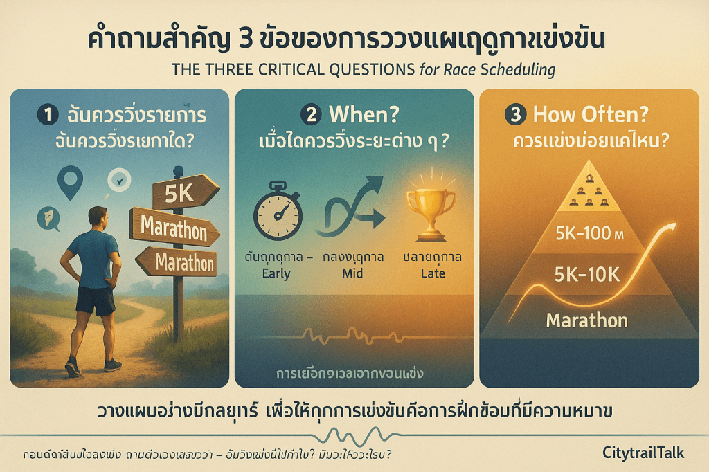 คำถามสำคัญ 3 ข้อ (The Three Critical Questions) ถือเป็นหัวใจของกระบวนการ การวางแผนฤดูกาลแข่งขัน (Scheduling) โดยเฉพาะอย่างยิ่งสำหรับนักวิ่งที่อยู่ในทีมโรงเรียนหรือทีมวิทยาลัย ซึ่งมีตารางการแข่งขันที่ค่อนข้างหนาแน่น ภายใต้แนวคิดของ Daniels’ Formula คำถามเหล่านี้เป็นเครื่องมือทางกลยุทธ์ที่ช่วยให้มั่นใจว่า การแข่งขันทุกครั้งมีวัตถุประสงค์เฉพาะเจาะจงและสอดคล้องกับแผนการฝึกซ้อมโดยรวม